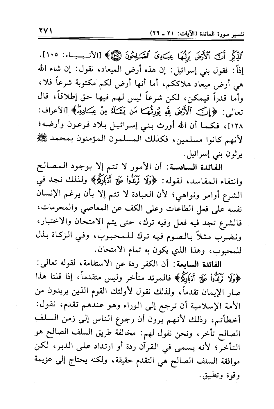 الفائدة السادسة: أن الأمور لا تتم إلا بوجود المصالح وانتفاء المفاسد، لقوله: {وَلَا تَرْتَدُّوا عَلَى أَدْبَارِكُمْ} ولذلك نجد في الشرع أوامر ونواهي؛ لأن العبادة لا تتم إلا بأن يرغم الإنسان نفسه على فعل الطاعات وعلى الكف عن المعاصي والمحرمات، فالشرع تجد فيه فعل وفيه ترك، حتى يتم الامتحان والاختبار، ونضرب مثلًا بالصوم فيه ترك للمحبوب، وفي الزكاة بذل للمحبوب، وهذا الذي يكون به تمام الامتحان.