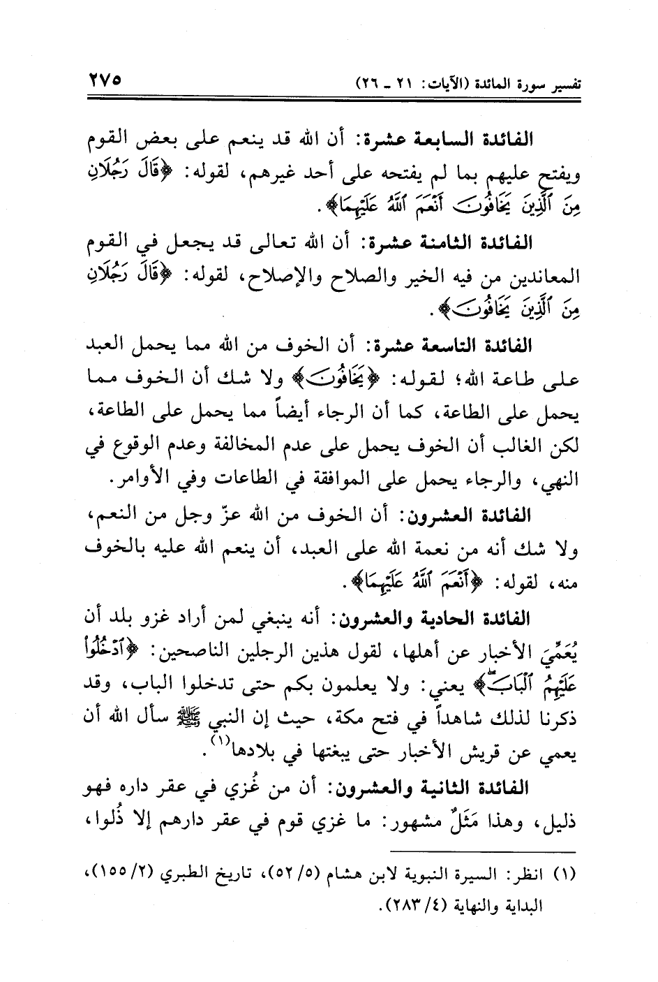 الفائدة السابعة عشرة: أن الله قد ينعم على بعض القوم ويفتح عليهم بما لم يفتحه على أحد غيرهم، لقوله: {قَالَ رَجُلَانِ مِنَ الَّذِينَ يَخَافُونَ أَنْعَمَ اللَّهُ عَلَيْهِمَا}.