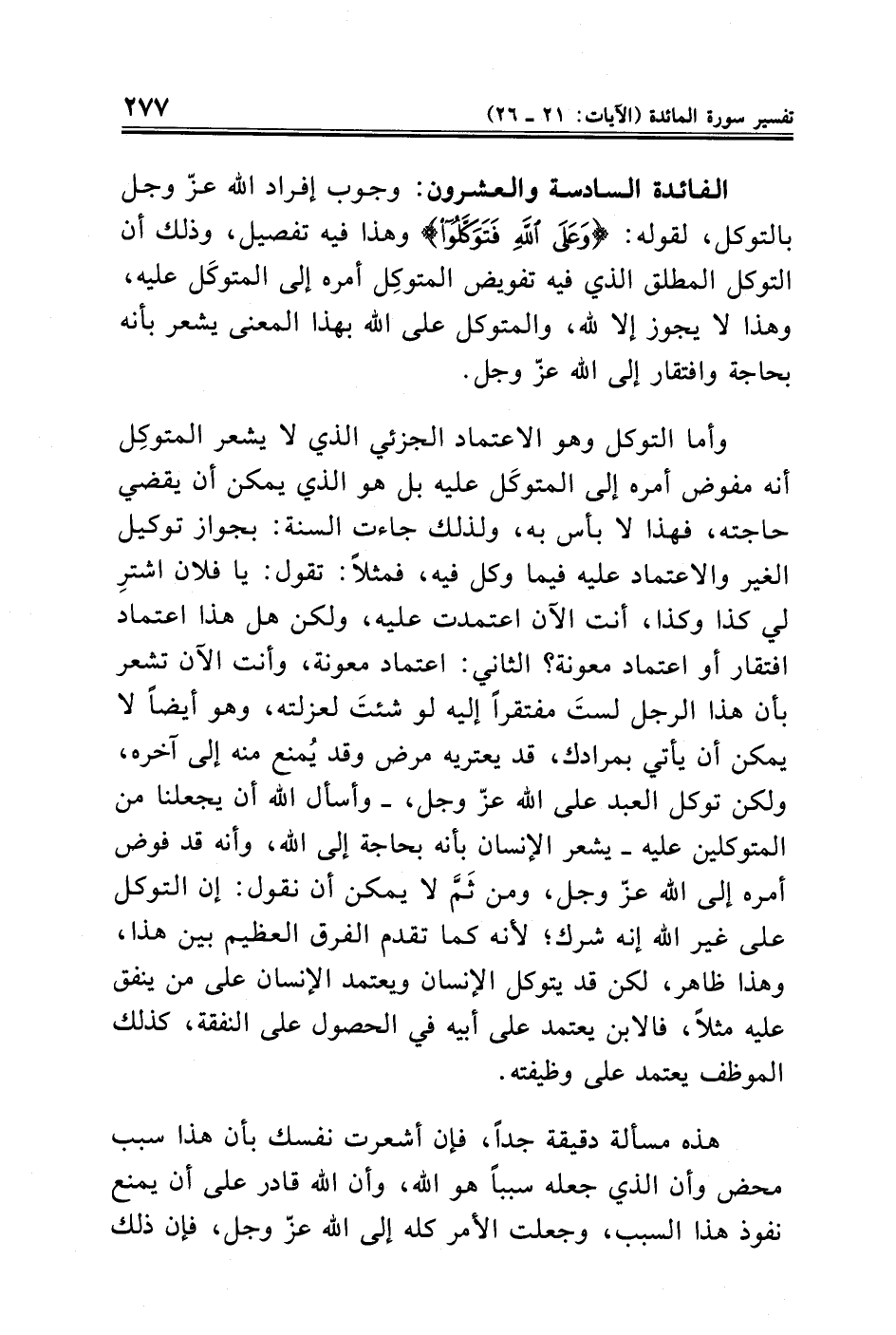 الفائدة السادسة والعشرون: وجوب إفراد الله عزّ وجل بالتوكل، لقوله: {وَعَلَى اللَّهِ فَتَوَكَّلُوا} وهذا فيه تفصيل، وذلك أن التوكل المطلق الذي فيه تفويض المتوكِل أمره إلى المتوكَل عليه، وهذا لا يجوز إلا لله، والمتوكل على الله بهذا المعنى يشعر بأنه بحاجة وافتقار إلى الله عزّ وجل.
