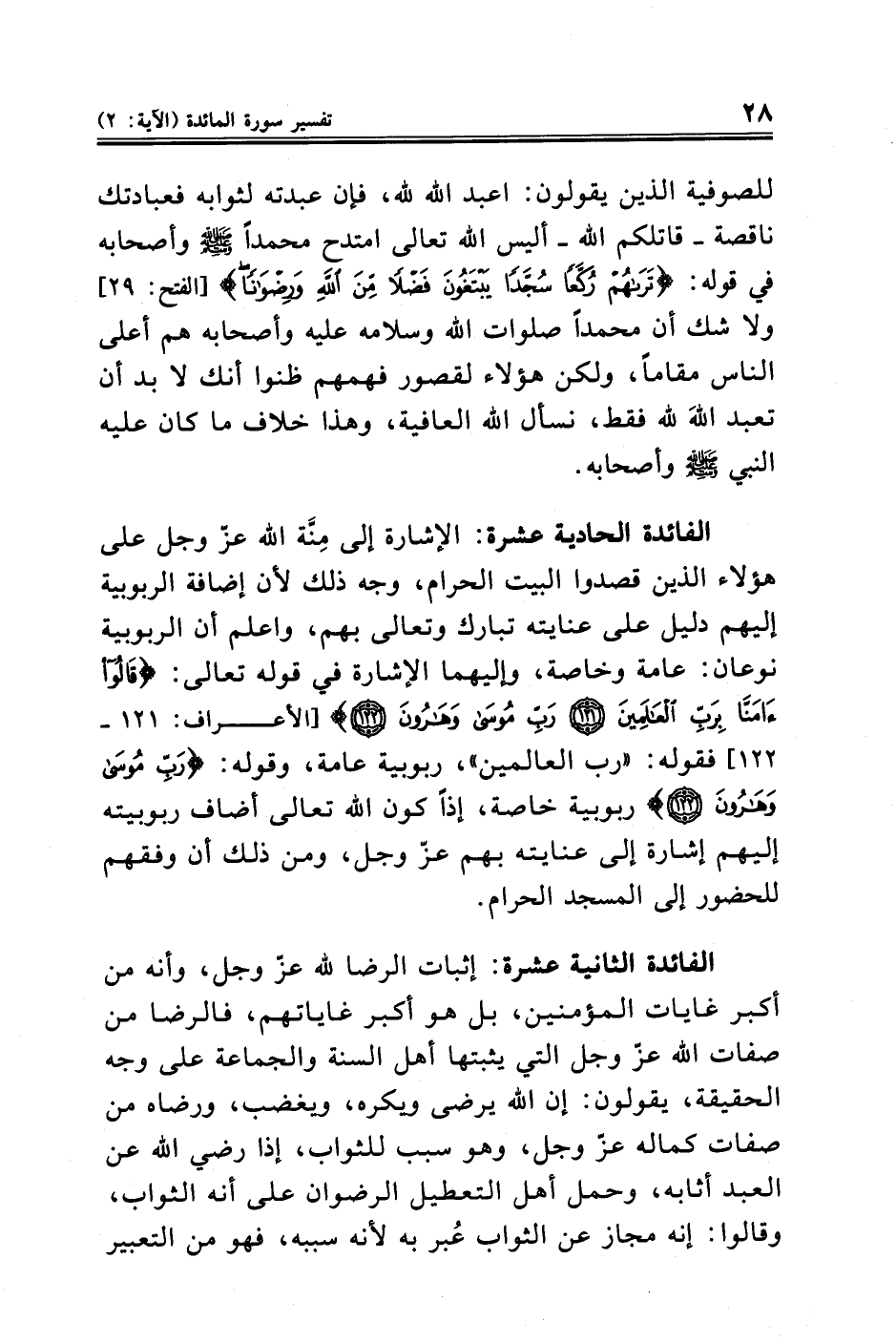للصوفية الذين يقولون: اعبد الله لله، فإن عبدته لثوابه فعبادتك ناقصة -قاتلكم الله- أليس الله تعالى امتدح محمدًا - صلى الله عليه وسلم - أصحابه في قوله: {تَرَاهُمْ رُكَّعًا سُجَّدًا يَبْتَغُونَ فَضْلًا مِنَ اللَّهِ وَرِضْوَانًا} [الفتح: ٢٩] ولا شك أن محمدًا صلوات الله وسلامه عليه وأصحابه هم أعلى الناس مقامًا، ولكن هؤلاء لقصور فهمهم ظنوا أنك لا بد أن تعبد اللهَ لله فقط، نسأل الله العافية، وهذا خلاف ما كان عليه النبي - صلى الله عليه وسلم - وأصحابه.