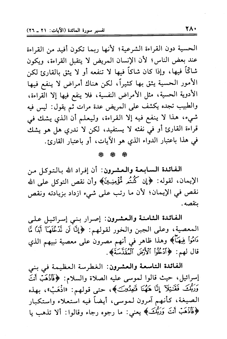 الفائدة التاسعة والعشرون: الغطرسة العظيمة في بني إسرائيل، حيث قالوا لموسى عليه الصلاة والسلام: {فَاذْهَبْ أَنْتَ وَرَبُّكَ فَقَاتِلَا إِنَّا هَاهُنَا قَاعِدُونَ}، حتى قولهم: "اذْهَبْ"، بهذه الصيغة، كأنهم آمرون لموسى، أيضًا فيه استعلاء واستكبار {فَاذْهَبْ أَنْتَ وَرَبُّكَ} يعني: ما رجوه رجاء وقالوا: ألا تذهب يا