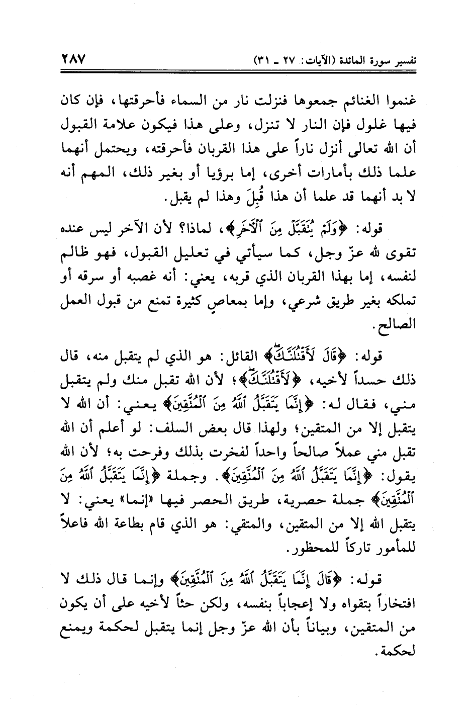 قوله: {قَالَ لَأَقْتُلَنَّكَ} القائل: هو الذي لم يتقبل منه، قال ذلك حسدًا لأخيه، {لَأَقْتُلَنَّكَ}؛ لأن الله تقبل منك ولم يتقبل مني، فقال له: {إِنَّمَا يَتَقَبَّلُ اللَّهُ مِنَ الْمُتَّقِينَ} يعني: أن الله لا يتقبل إلا من المتقين؛ ولهذا قال بعض السلف: لو أعلم أن الله تقبل مني عملًا صالحًا واحدًا لفخرت بذلك وفرحت به؛ لأن الله يقول: {إِنَّمَا يَتَقَبَّلُ اللَّهُ مِنَ الْمُتَّقِينَ}. وجملة {إِنَّمَا يَتَقَبَّلُ اللَّهُ مِنَ الْمُتَّقِينَ} جملة حصرية، طريق الحصر فيها "إنما" يعني: لا يتقبل الله إلا من المتقين، والمتقي: هو الذي قام بطاعة الله فاعلًا للمأمور تاركًا للمحظور.