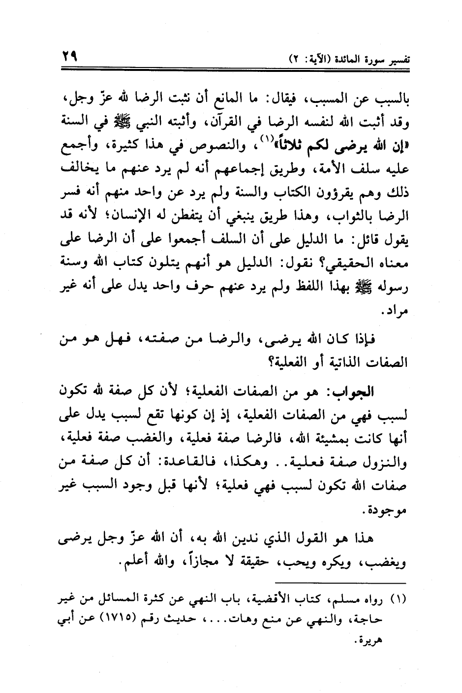 بالسبب عن المسبب، فيقال: ما المانع أن نثبت الرضا لله عز وجل، وقد أثبت الله لنفسه الرضا في القرآن، وأثبته النبي - صلى الله عليه وسلم - في السنة "إن الله يرضى لكم ثلاثًا" (¬١)، والنصوص في هذا كثيرة، وأجمع عليه سلف الأمة، وطريق إجماعهم أنه لم يرد عنهم ما يخالف ذلك وهم يقرؤون الكتاب والسنة ولم يرد عن واحد منهم أنه فسر الرضا بالثواب، وهذا طريق ينبغي أن يتفطن له الإنسان؛ لأنه قد يقول قائل: ما الدليل على أن السلف أجمعوا على أن الرضا على معناه الحقيقي؟ نقول: الدليل هو أنهم يتلون كتاب الله وسنة رسوله - صلى الله عليه وسلم - بهذا اللفظ ولم يرد عنهم حرف واحد يدل على أنه غير مراد.
