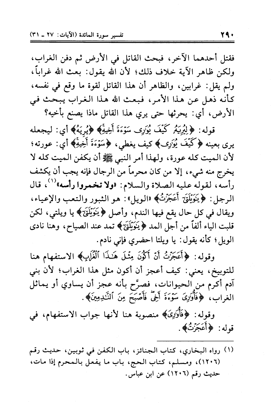 قوله: {لِيُرِيَهُ كَيْفَ يُوَارِي سَوْءَةَ أَخِيهِ} {لِيُرِيَهُ} أي: ليجعله يرى بعينه {كَيْفَ يُوَارِي} كيف يغطي، {سَوْءَةَ أَخِيهِ} أي: عورته؛ لأن الميت كله عورة، ولهذا أمر النبي - صلى الله عليه وسلم - أن يكفن الميت كله لا يخرج منه شيء، إلا من كان محرمًا من الرجال فإنه يجب أن يكشف رأسه، لقوله عليه الصلاة والسلام: "ولا تخمروا رأسه" (¬١)، قال الرجل: {يَاوَيْلَتَا أَعَجَزْتُ} "الويل": هو الثبور والتعب والإعياء، ويقال في كل حال يقع فيها الندم، وأصل {يَاوَيْلَتَا} يا ويلتي، لكن قلبت الياء ألفًا من أجل المد {يَاوَيْلَتَا} تمد عند الصياح، وهنا نادى الويل؛ كأنه يقول: يا ويلتا احضري فإني نادم.