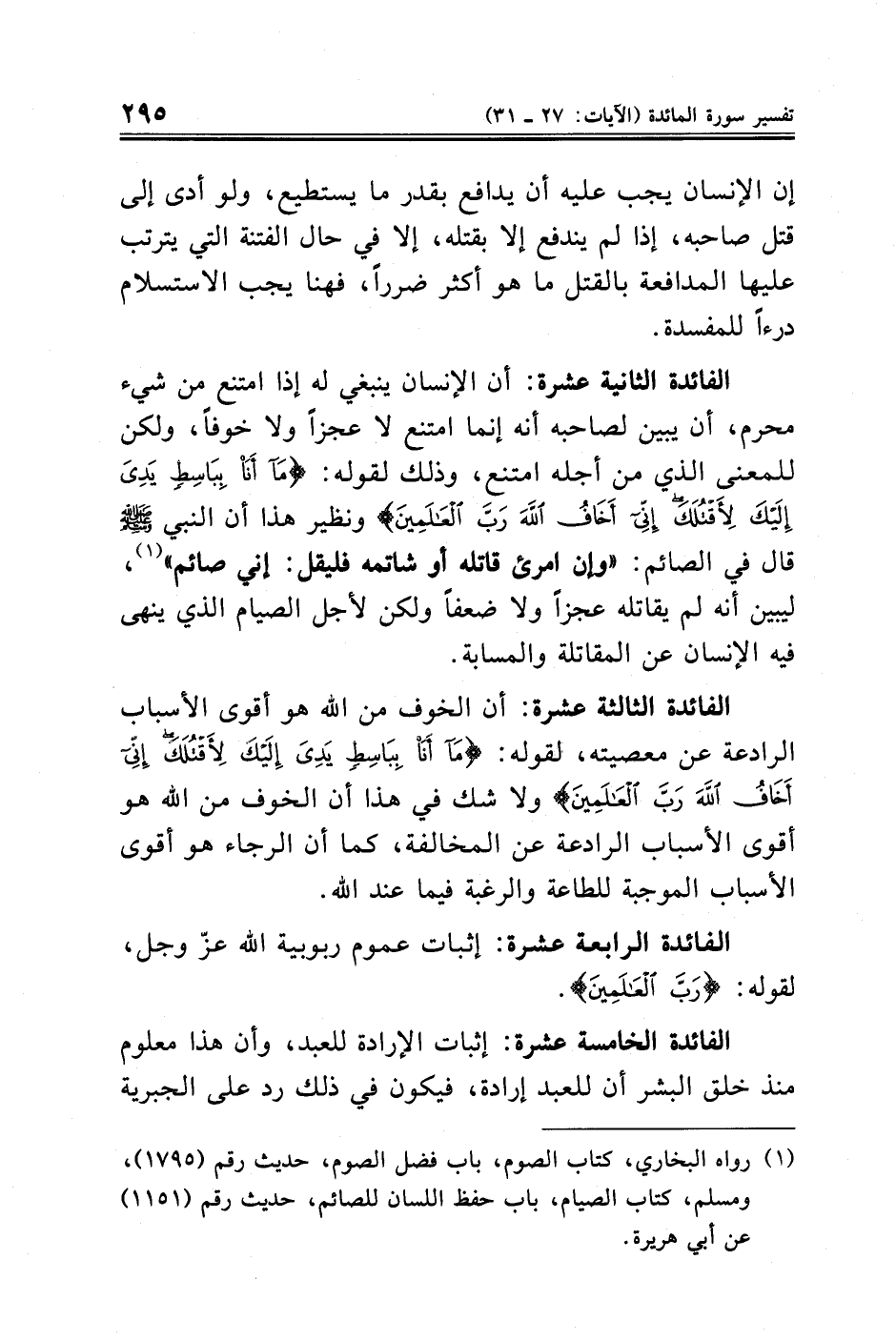 محرم، أن يبين لصاحبه أنه إنما امتنع لا عجزًا ولا خوفًا، ولكن للمعنى الذي من أجله امتنع، وذلك لقوله: {مَا أَنَا بِبَاسِطٍ يَدِيَ إِلَيْكَ لِأَقْتُلَكَ إِنِّي أَخَافُ اللَّهَ رَبَّ الْعَالَمِينَ} ونظير هذا أن النبي - صلى الله عليه وسلم - قال في الصائم: "وإن امرئ قاتله أو شاتمه فليقل: اني صائم" (¬١)، ليبين أنه لم يقاتله عجزًا ولا ضعفًا ولكن لأجل الصيام الذي ينهى فيه الإنسان عن المقاتلة والمسابة.