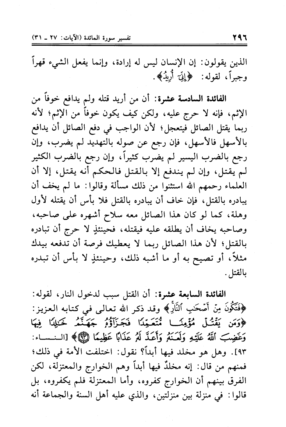 الفائدة السابعة عشرة: أن القتل سبب لدخول النار، لقوله: {فَتَكُونَ مِنْ أَصْحَابِ النَّارِ} وقد ذكر الله تعالى في كتابه العزيز: {وَمَنْ يَقْتُلْ مُؤْمِنًا مُتَعَمِّدًا فَجَزَاؤُهُ جَهَنَّمُ خَالِدًا فِيهَا وَغَضِبَ اللَّهُ عَلَيْهِ وَلَعَنَهُ وَأَعَدَّ لَهُ عَذَابًا عَظِيمًا (٩٣)} [النساء: ٩٣]. وهل هو مخلد فيها أبدًا؟ نقول: اختلفت الأمة في ذلك؛ فمنهم من قال: إنه مخلدٌ فيها أبدًا وهم الخوارج والمعتزلة، لكن الفرق بينهم أن الخوارج كفروه، وأما المعتزلة فلم يكفروه، بل قالوا: في منزلة بين منزلتين، والذي عليه أهل السنة والجماعة أنه
