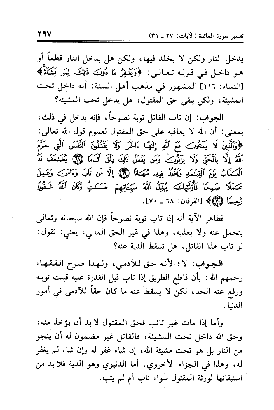 يدخل النار ولكن لا يخلد فيها, ولكن هل يدخل النار قطعًا أو هو داخل في قوله تعالى: {وَيَغْفِرُ مَا دُونَ ذَلِكَ لِمَنْ يَشَاءُ} [النساء: ١١٦] المشهور في مذهب أهل السنة: أنه داخل تحت المشيئة، ولكن يبقى حق المقتول، هل يدخل تحت المشيئة؟