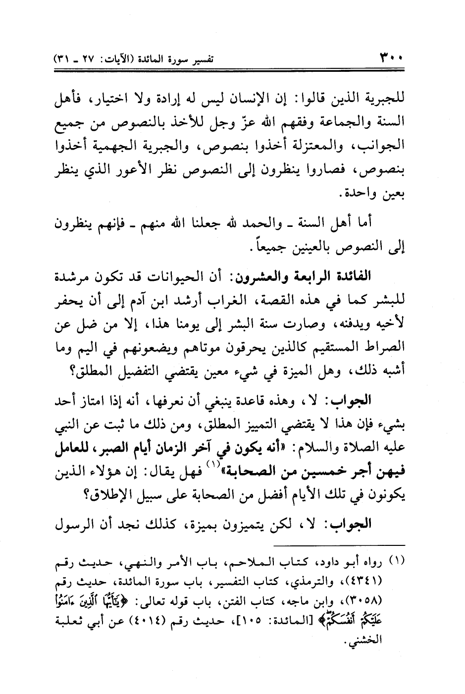 (¬١) رواه أبو داود، كتاب الملاحم، باب الأمر والنهي، حديث رقم (٤٣٤١)، والترمذي، كتاب التفسير، باب سورة المائدة، حديث رقم (٣٠٥٨)، وابن ماجه، كتاب الفتن، باب قوله تعالى: {يَاأَيُّهَا الَّذِينَ آمَنُوا عَلَيْكُمْ أَنْفُسَكُم} [المائدة: ١٠٥] , حديث رقم (٤٠١٤) عن أبي ثعلبة الخشني.