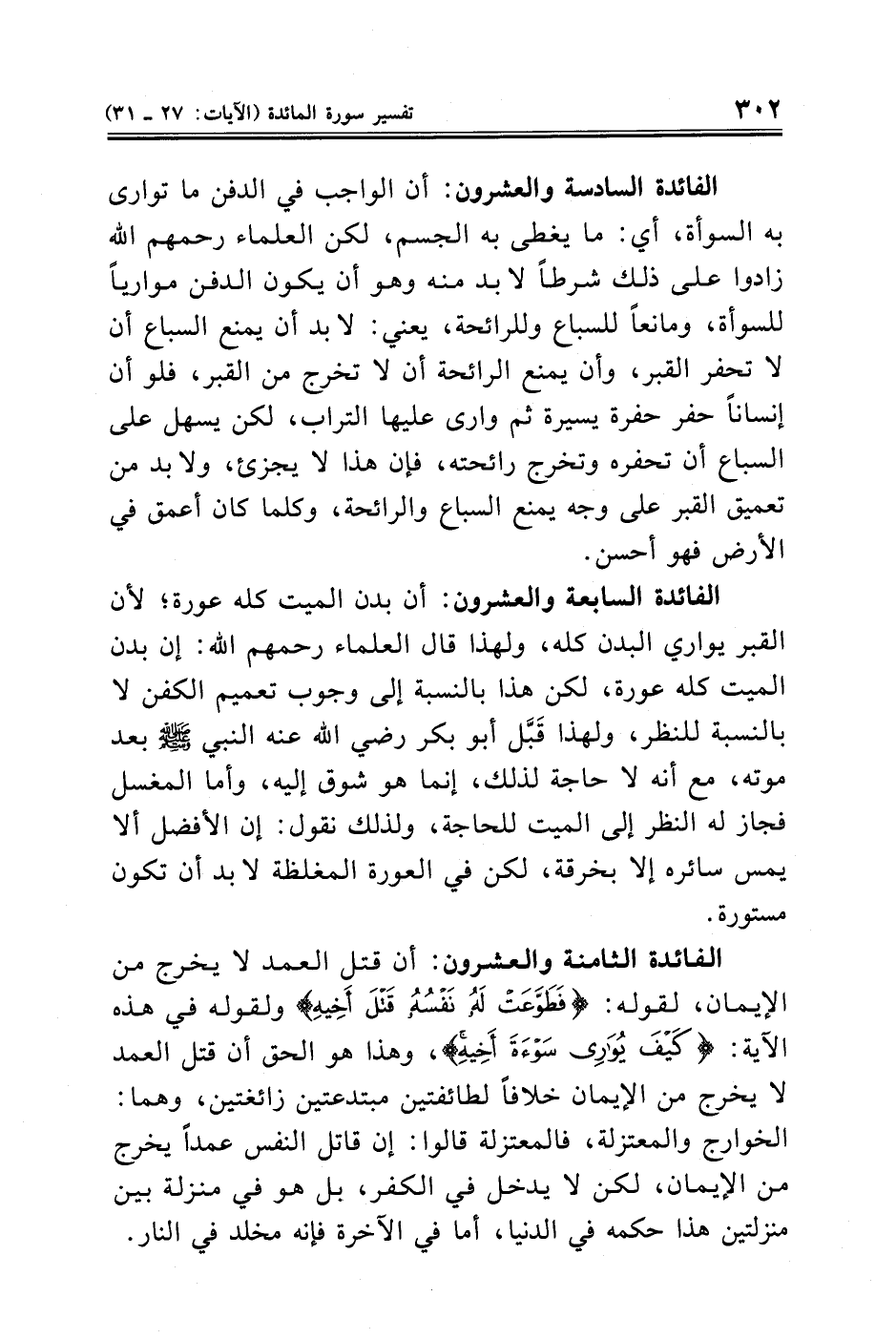 الفائدة الثامنة والعشرون: أن قتل العمد لا يخرج من الإيمان، لقوله: {فَطَوَّعَتْ لَهُ نَفْسُهُ قَتْلَ أَخِيهِ} ولقوله في هذه الآية: {كَيْفَ يُوَارِي سَوْءَةَ أَخِيهِ، وهذا هو الحق أن قتل العمد لا يخرج من الإيمان خلافًا لطائفتين مبتدعتين زائغتين، وهما: الخوارج والمعتزلة، فالمعتزلة قالوا: إن قاتل النفس عمدًا يخرج من الإيمان، لكن لا يدخل في الكفر، بل هو في منزلة بين منزلتين هذا حكمه في الدنيا، أما في الآخرة فإنه مخلد في النار.