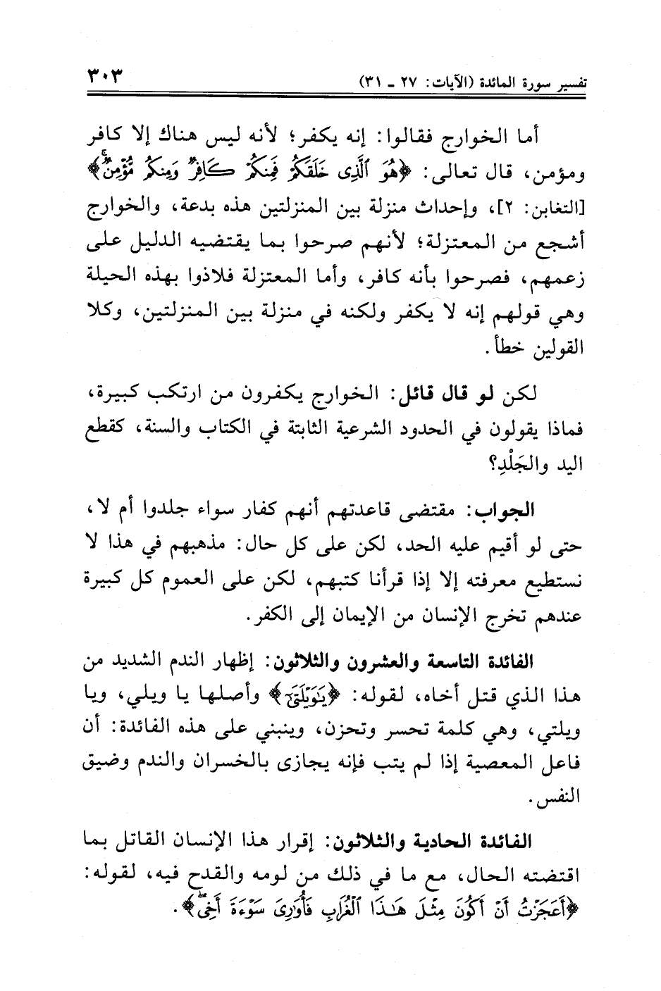 الفائدة التاسعة والعشرون والثلاثون: إظهار الندم الشديد من هذا الذي قتل أخاه، لقوله: {يَاوَيْلَتَى} وأصلها يا ويلي، ويا ويلتي، وهي كلمة تحسر وتحزن، وينبني على هذه الفائدة: أن فاعل المعصية إذا لم يتب فإنه يجازى بالخسران والندم وضيق النفس.