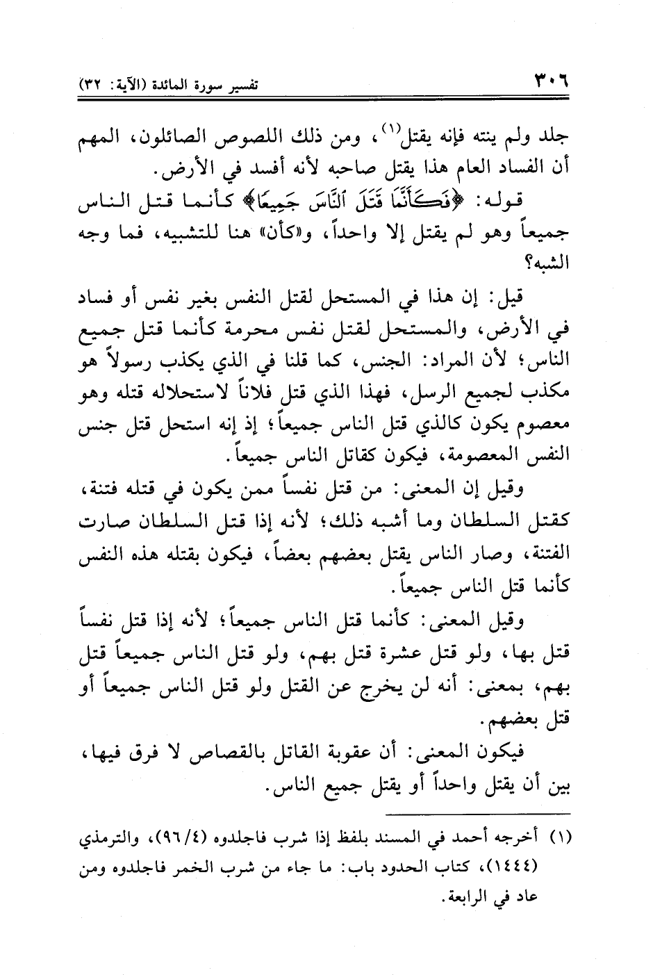 وقيل إن المعنى: من قتل نفسًا ممن يكون في قتله فتنة، كقتل السلطان وما أشبه ذلك؛ لأنه إذا قتل السلطان صارت الفتنة، وصار الناس يقتل بعضهم بعضًا، فيكون بقتله هذه النفس كأنما قتل الناس جميعًا.