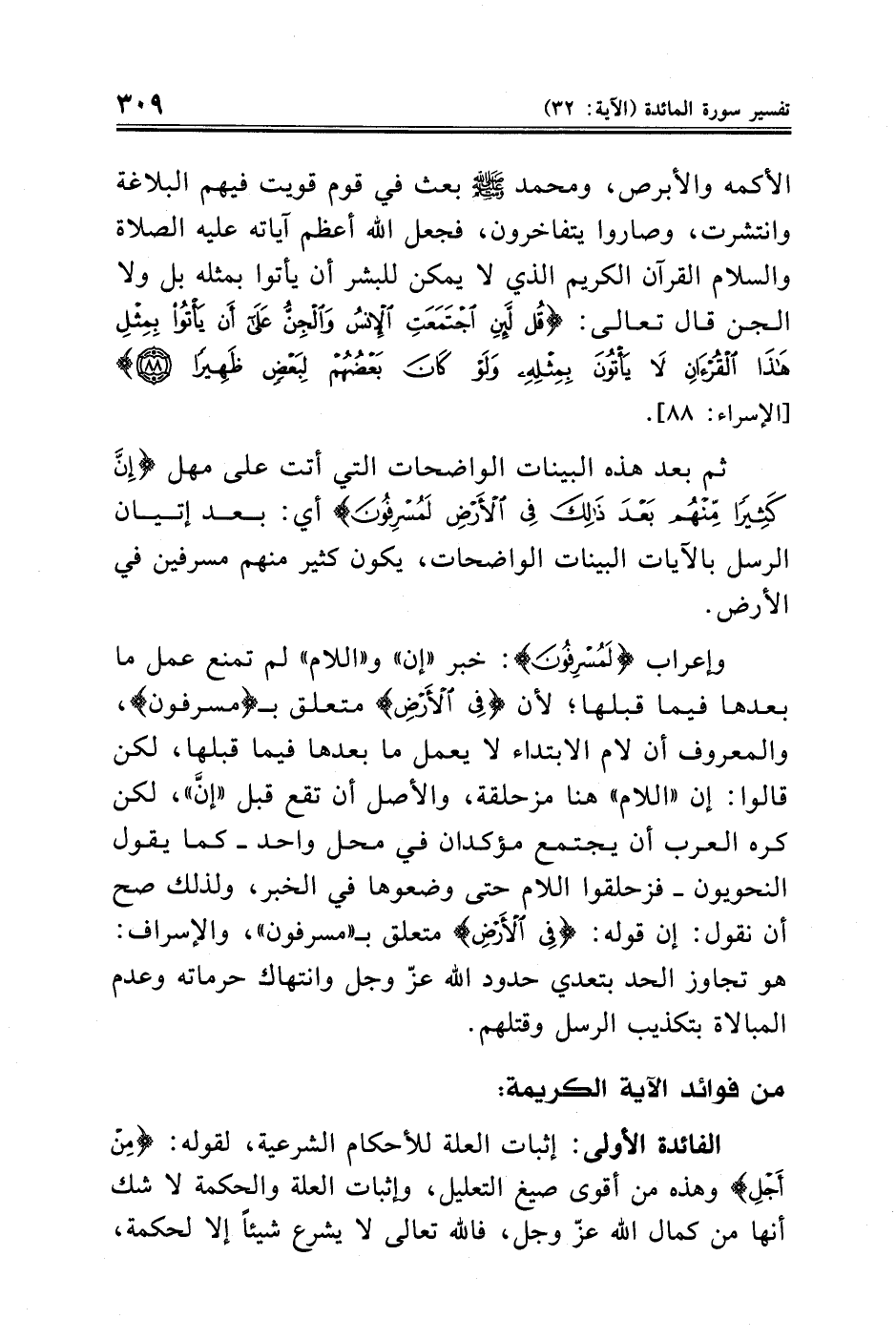 الفائدة الأولى: إثبات العلة للأحكام الشرعية، لقوله: {مِنْ أَجْلِ} وهذه من أقوى صيغ التعليل، وإثبات العلة والحكمة لا شك أنها من كمال الله عزّ وجل، فالله تعالى لا يشرع شيئًا إلا لحكمة،
