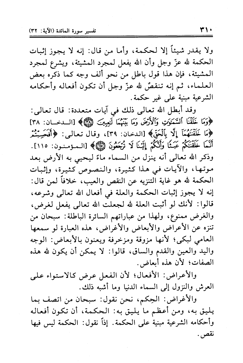 وقد أبطل الله تعالى ذلك في آيات متعددة: قال تعالى: {وَمَا خَلَقْنَا السَّمَاوَاتِ وَالْأَرْضَ وَمَا بَيْنَهُمَا لَاعِبِينَ} [الدخان: ٣٨] {مَا خَلَقْنَاهُمَا إِلَّا بِالْحَقِّ} [الدخان: ٣٩]، وقال تعالى: {أَفَحَسِبْتُمْ أَنَّمَا خَلَقْنَاكُمْ عَبَثًا وَأَنَّكُمْ إِلَيْنَا لَا تُرْجَعُونَ} [المؤمنون: ١١٥]. وذكر الله تعالى أنه ينزل من السماء ماءً ليحيي به الأرض بعد موتها، والآيات في هذا كثيرة، والنصوص كثيرة، وإثبات الحكمة لله هو غاية التنزيه عن النقص والعيب، خلافًا لمن قال: إنه لا يجوز إثبات الحكمة والعلة في أفعال الله تعالى وشرعه، قالوا: لأنك لو أثبت العلة لله لجعلت الله تعالى يفعل لغرض، والغرض ممنوع، ولهذا من عباراتهم السائرة الباطلة: سبحان من تنزه عن الأعراض والأبعاض والأغراض، هذه العبارة لو سمعها العامي لبكى؛ لأنها مزوقة ومزخرفة ويعنون بالأبعاض: الوجه واليد والعين والقدم والساق، قالوا: لا يمكن أن يكون لله هذه الصفات؛ لأن هذه أبعاض.