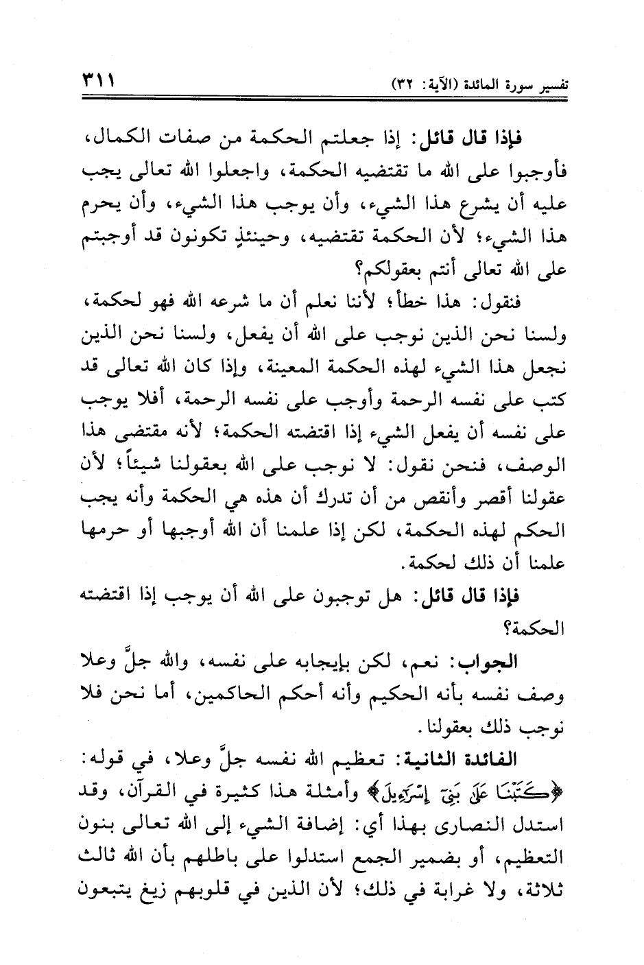 فنقول: هذا خطأ؛ لأننا نعلم أن ما شرعه الله فهو لحكمة، ولسنا نحن الذين نوجب على الله أن يفعل، ولسنا نحن الذين نجعل هذا الشيء لهذه الحكمة المعينة، وإذا كان الله تعالى قد كتب على نفسه الرحمة وأوجب على نفسه الرحمة، أفلا يوجب على نفسه أن يفعل الشيء إذا اقتضته الحكمة؛ لأنه مقتضى هذا الوصف، فنحن نقول: لا نوجب على الله بعقولنا شيئًا؛ لأن عقولنا أقصر وأنقص من أن تدرك أن هذه هي الحكمة وأنه يجب الحكم لهذه الحكمة، لكن إذا علمنا أن الله أوجبها أو حرمها علمنا أن ذلك لحكمة.