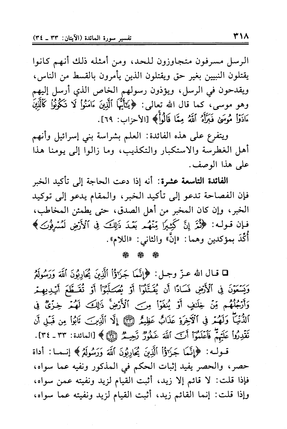 قوله: {إِنَّمَا جَزَاءُ الَّذِينَ يُحَارِبُونَ اللَّهَ وَرَسُولَهُ} إنما: أداة حصر، والحصر يفيد إثبات الحكم في المذكور ونفيه عما سواه، فإذا قلت: لا قائم إلا زيد، أثبت القيام لزيد ونفيته عمن سواه، وإذا قلت: إنما القائم زيد، أثبت القيام لزيد ونفيته عما سواه،
