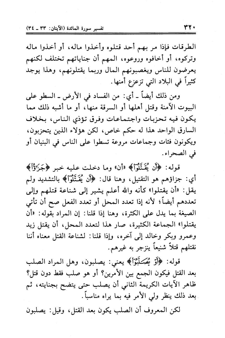 قوله: {أَوْ يُصَلَّبُوا} يعني: يصلبون، وهل المراد الصلب بعد القتل فيكون الجمع بين الأمرين؟ أو هو صلب فقط دون قتل؟ ظاهر الآيات الكريمة الثاني أن يصلب حتى يتضح بجنايته، ثم بعد ذلك ينظر ولي الأمر فيه بما يراه مناسبًا.