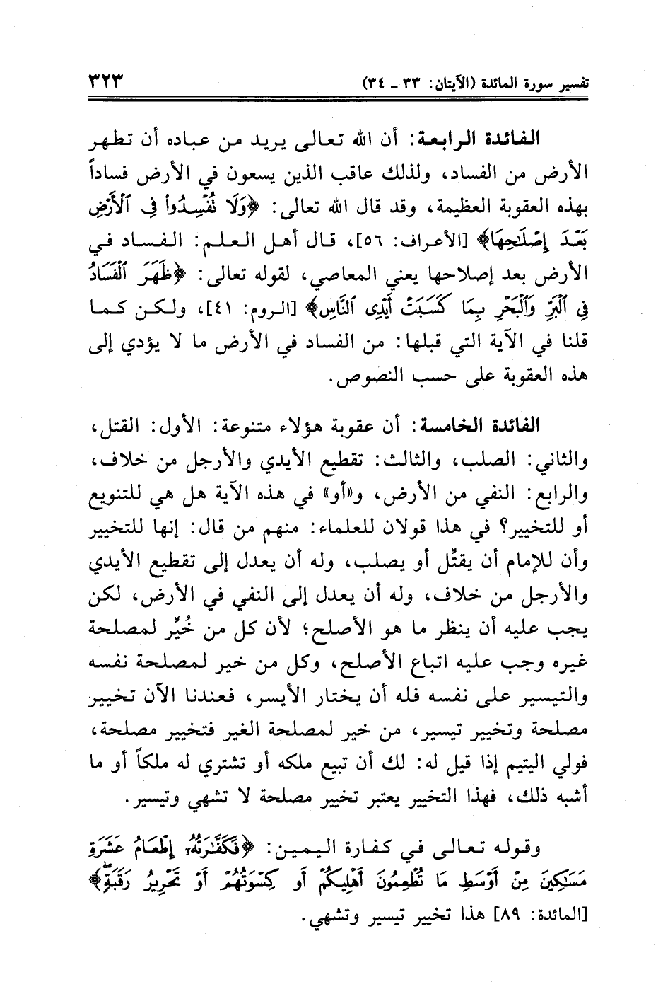 الفائدة الخامسة: أن عقوبة هؤلاء متنوعة: الأول: القتل، والثاني: الصلب، والثالث: تقطيع الأيدي والأرجل من خلاف، والرابع: النفي من الأرض، و"أو" في هذه الآية هل هي للتنويع أو للتخيير؟ في هذا قولان للعلماء: منهم من قال: إنها للتخيير وأن للإمام أن يقتِّل أو يصلب، وله أن يعدل إلى تقطيع الأيدي والأرجل من خلاف، وله أن يعدل إلى النفي في الأرض، لكن يجب عليه أن ينظر ما هو الأصلح؛ لأن كل من خُيِّر لمصلحة غيره وجب عليه اتباع الأصلح، وكل من خير لمصلحة نفسه والتيسير على نفسه فله أن يختار الأيسر، فعندنا الآن تخيير مصلحة وتخيير تيسير، من خير لمصلحة الغير فتخيير مصلحة، فولي اليتيم إذا قيل له: لك أن تبيع ملكه أو تشترى له ملكًا أو ما أشبه ذلك، فهذا التخيير يعتبر تخيير مصلحة لا تشهي وتيسير.