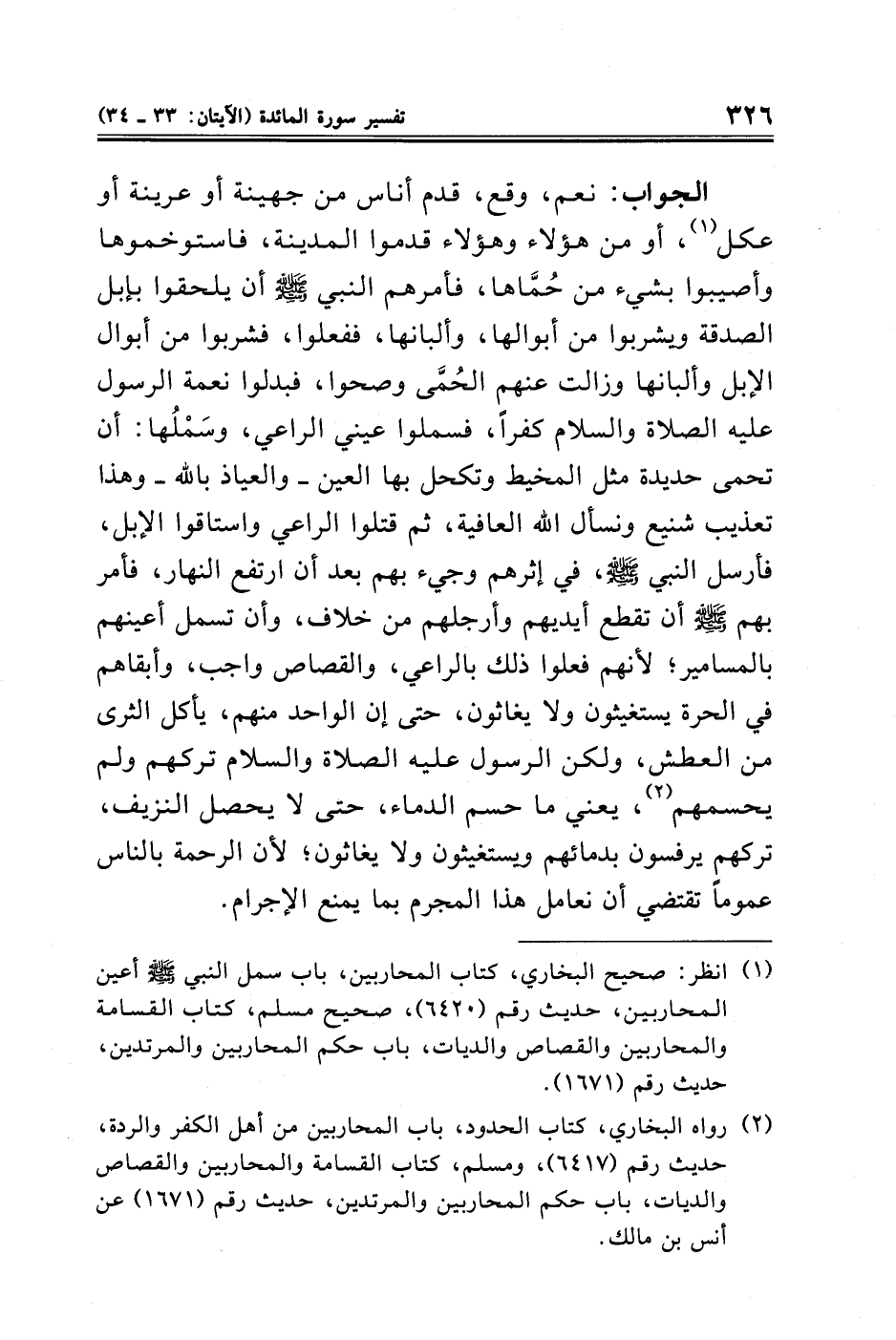 (¬١) انظر: صحيح البخاري، كتاب المحاربين، باب سمل النبي - صلى الله عليه وسلم - أعين المحاربين، حديث رقم (٦٤٢٠)، صحيح مسلم، كتاب القسامة والمحاربين والقصاص والديات، باب حكم المحاربين والمرتدين، حديث رقم (١٦٧١).