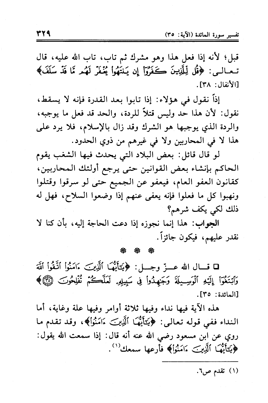 إذًا نقول في هؤلاء: إذا تابوا بعد القدرة فإنه لا يسقط، نقول: لأن هذا حد وليس قتلًا للردة، والحد قد فعل ما يوجبه، والردة الذي يوجبها هو الشرك وقد زال بالإسلام، فلا يرد على هذا لا في المحاربين ولا في غيرهم من ذوي الحدود. لو قال قائل: بعض البلاد التي يحدث فيها الشغب يقوم الحاكم بإنشاء بعض القوانين حتى يرجع أولئك المحاربين، كقانون العفو العام، فيعفو عن الجميع حتى لو سرقوا وقتلوا ونهبوا كل ما فعلوا فإنه يعفى عنهم إذا وضعوا السلاح، فهل له ذلك لكي يكف شرهم؟