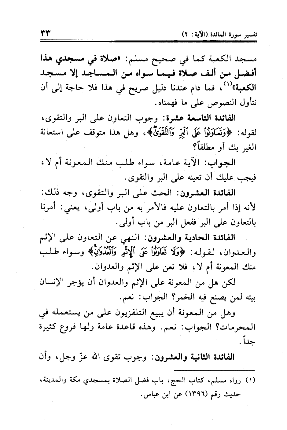 الفائدة الحادية والعشرون: النهي عن التعاون على الإثم والعدوان، لقوله: {وَلَا تَعَاوَنُوا عَلَى الْإِثْمِ وَالْعُدْوَانِ} وسواء طلب منك المعونة أم لا، فلا تعن على الإثم والعدوان.