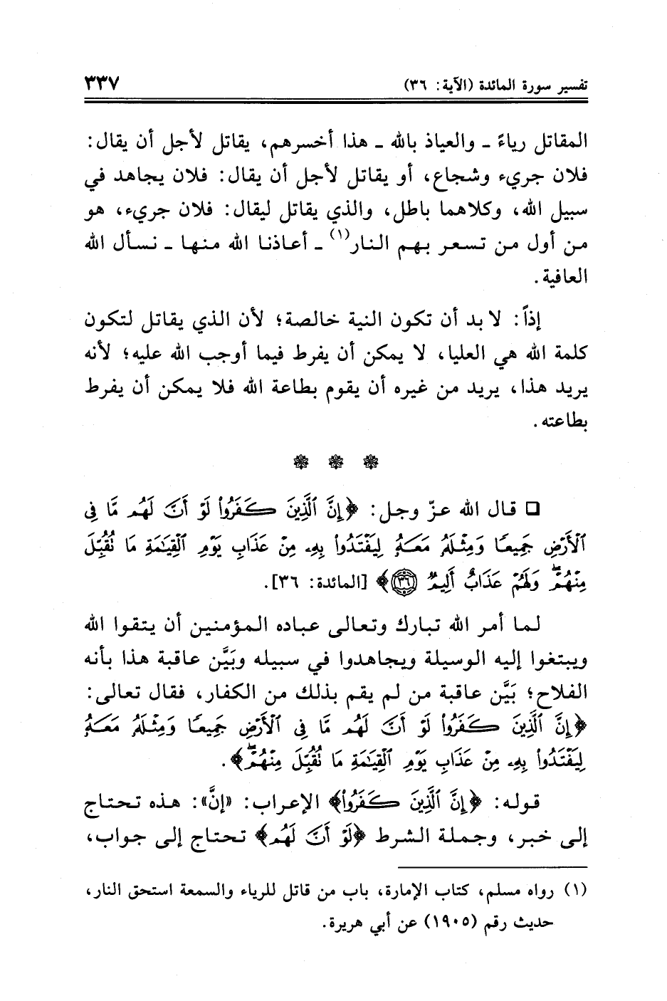 (¬١) رواه مسلم، كتاب الإمارة، باب من قاتل للرياء والسمعة استحق النار، حديث رقم (١٩٠٥) عن أبي هريرة.