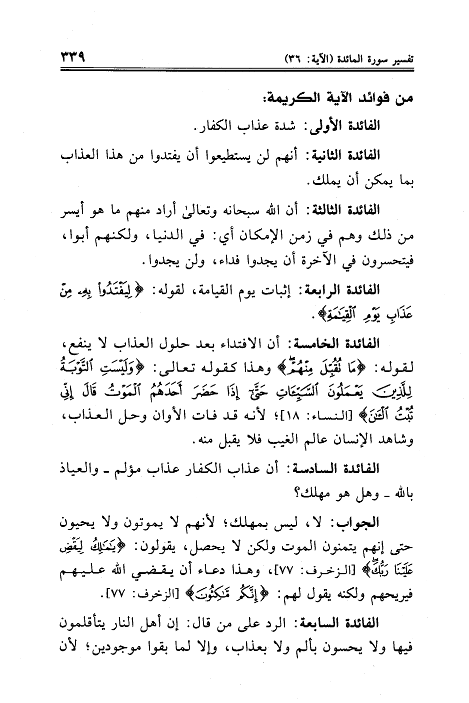 الفائدة الرابعة: إثبات يوم القيامة، لقوله: {لِيَفْتَدُوا بِهِ مِنْ عَذَابِ يَوْمِ الْقِيَامَةِ}.