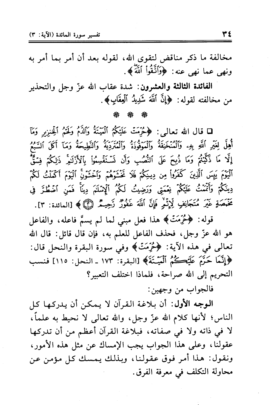 ° قال الله تعالى: {حُرِّمَتْ عَلَيْكُمُ الْمَيْتَةُ وَالدَّمُ وَلَحْمُ الْخِنْزِيرِ وَمَا أُهِلَّ لِغَيْرِ اللَّهِ بِهِ وَالْمُنْخَنِقَةُ وَالْمَوْقُوذَةُ وَالْمُتَرَدِّيَةُ وَالنَّطِيحَةُ وَمَا أَكَلَ السَّبُعُ إِلَّا مَا ذَكَّيْتُمْ وَمَا ذُبِحَ عَلَى النُّصُبِ وَأَنْ تَسْتَقْسِمُوا بِالْأَزْلَامِ ذَلِكُمْ فِسْقٌ الْيَوْمَ يَئِسَ الَّذِينَ كَفَرُوا مِنْ دِينِكُمْ فَلَا تَخْشَوْهُمْ وَاخْشَوْنِ الْيَوْمَ أَكْمَلْتُ لَكُمْ دِينَكُمْ وَأَتْمَمْتُ عَلَيْكُمْ نِعْمَتِي وَرَضِيتُ لَكُمُ الْإِسْلَامَ دِينًا فَمَنِ اضْطُرَّ فِي مَخْمَصَةٍ غَيْرَ مُتَجَانِفٍ لِإِثْمٍ فَإِنَّ اللَّهَ غَفُورٌ رَحِيمٌ (٣)} [المائدة: ٣].