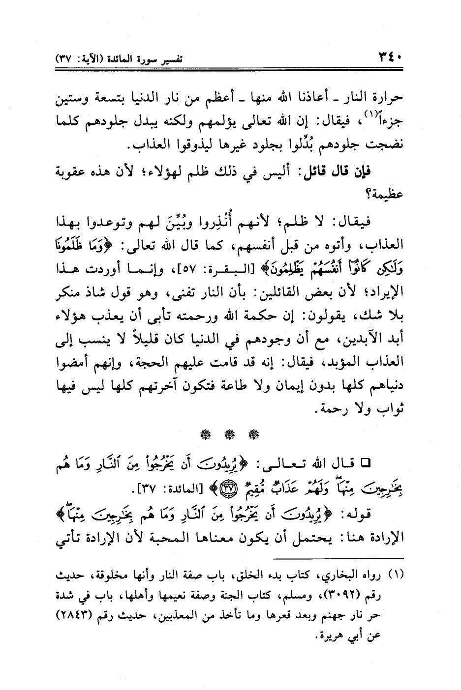 (¬١) رواه البخاري، كتاب بدء الخلق، باب صفة النار وأنها مخلوقة، حديث رقم (٣٠٩٢)، ومسلم، كتاب الجنة وصفة نعيمها وأهلها، باب في شدة حر نار جهنم وبعد قعرها وما تأخذ من المعذبين، حديث رقم (٢٨٤٣) عن أبي هريرة.