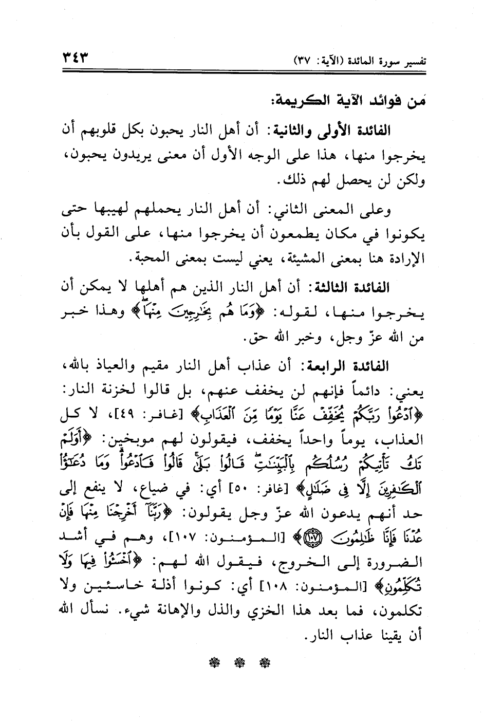 الفائدة الرابعة: أن عذاب أهل النار مقيم والعياذ بالله، يعني: دائمًا فإنهم لن يخفف عنهم، بل قالوا لخزنة النار: {ادْعُوا رَبَّكُمْ يُخَفِّفْ عَنَّا يَوْمًا مِنَ الْعَذَابِ} [غافر: ٤٩]، لا كل العذاب، يومًا واحدًا يخفف، فيقولون لهم موبخين: {أَوَلَمْ تَكُ تَأْتِيكُمْ رُسُلُكُمْ بِالْبَيِّنَاتِ قَالُوا بَلَى قَالُوا فَادْعُوا وَمَا دُعَاءُ الْكَافِرِينَ إِلَّا فِي ضَلَالٍ} [غافر: ٥٠] أي: في ضياع، لا ينفع إلى حد أنهم يدعون الله عزّ وجل يقولون: {رَبَّنَا أَخْرِجْنَا مِنْهَا فَإِنْ عُدْنَا فَإِنَّا ظَالِمُونَ (١٠٧)} [المؤمنون: ١٠٧]، وهم في أشد الضرورة إلى الخروج، فيقول الله لهم: {اخْسَئُوا فِيهَا وَلَا تُكَلِّمُونِ} [المؤمنون: ١٠٨] أي: كونوا أذلة خاسئين ولا تكلمون، فما بعد هذا الخزي والذل والإهانة شيء. نسأل الله أن يقينا عذاب النار.