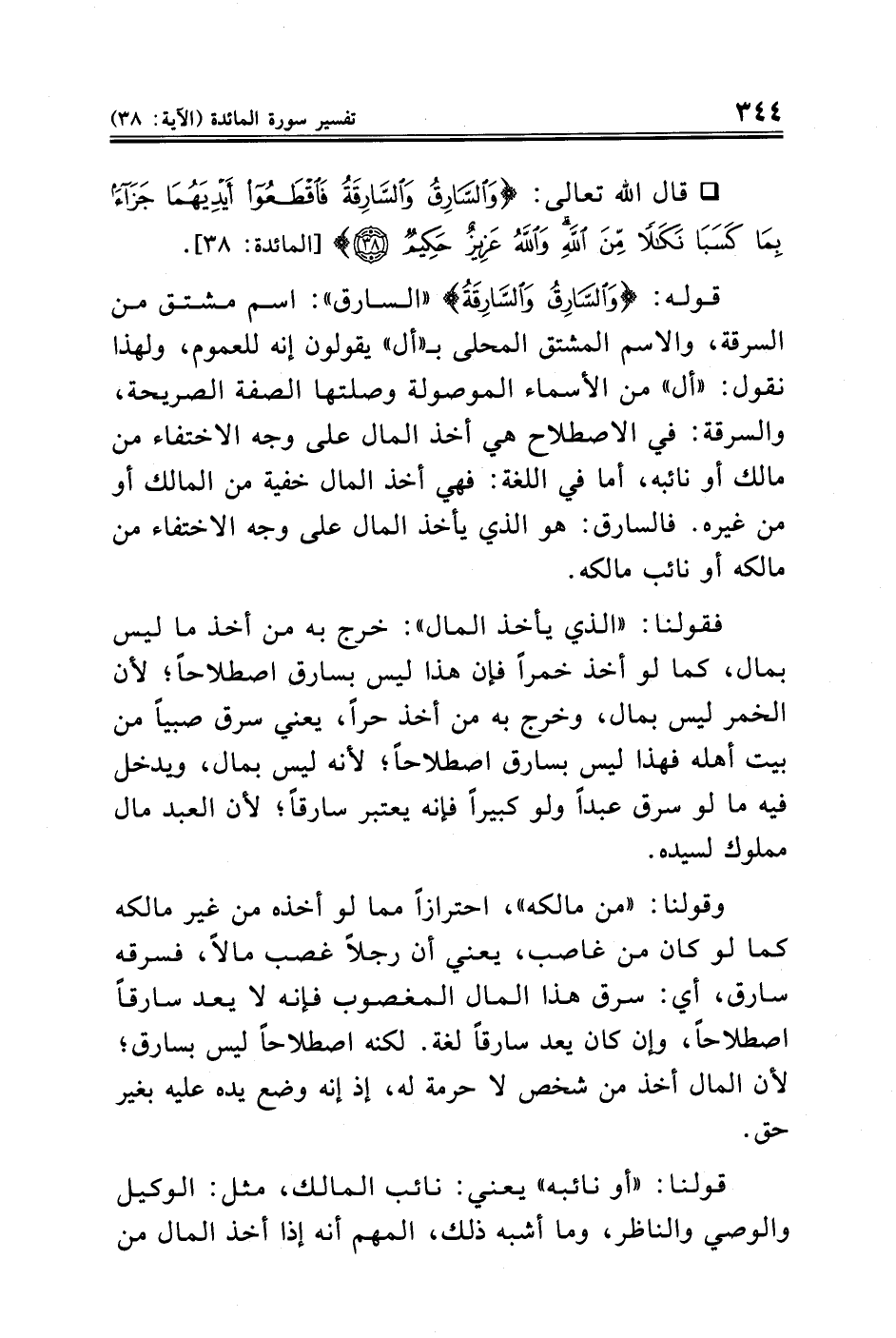 قوله: {وَالسَّارِقُ وَالسَّارِقَةُ} "السارق": اسم مشتق من السرقة، والاسم المشتق المحلى بـ "أل" يقولون إنه للعموم، ولهذا نقول: "أل" من الأسماء الموصولة وصلتها الصفة الصريحة، والسرقة: في الاصطلاح هي أخذ المال على وجه الاختفاء من مالك أو نائبه، أما في اللغة: فهي أخذ المال خفية من المالك أو من غيره. فالسارق: هو الذي يأخذ المال على وجه الاختفاء من مالكه أو نائب مالكه.