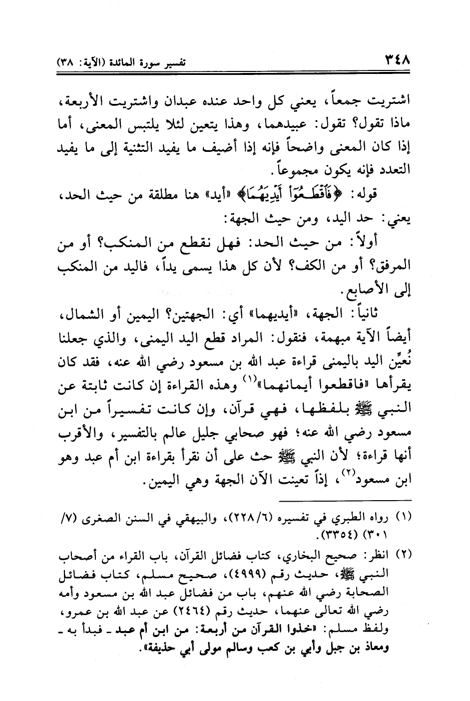 ثانيًا: الجهة، "أيديهما" أي: الجهتين؟ اليمين أو الشمال، أيضًا الآية مبهمة، فنقول: المراد قطع اليد اليمنى، والذي جعلنا نُعيِّن اليد باليمنى قراءة عبد الله بن مسعود رضي الله عنه، فقد كان يقرأها "فاقطعوا أيمانهما" (¬١) وهذه القراءة إن كانت ثابتة عن النبي - صلى الله عليه وسلم - بلفظها، فهي قرآن، وإن كانت تفسيرًا من ابن مسعود رضي الله عنه؛ فهو صحابي جليل عالم بالتفسير، والأقرب أنها قراءة؛ لأن النبي - صلى الله عليه وسلم - حث على أن نقرأ بقراءة ابن أم عبد وهو ابن مسعود (¬٢)، إذًا تعينت الآن الجهة وهي اليمين.