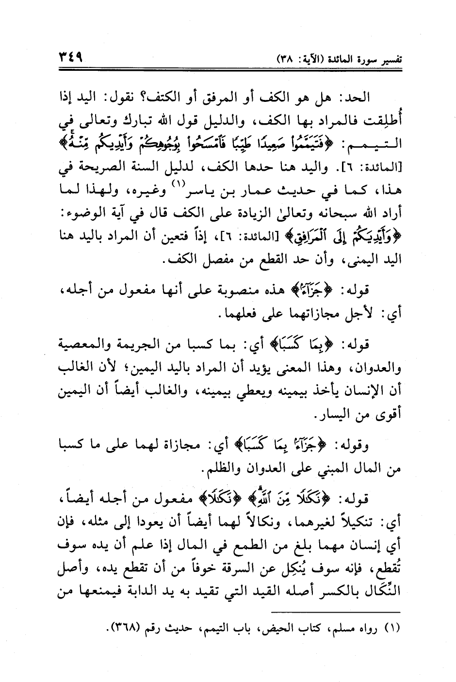 قوله: {نَكَالًا مِنَ اللَّهِ} {نَكَالًا} مفعول من أجله أيضًا، أي: تنكيلًا لغيرهما، ونكالًا لهما أيضًا أن يعودا إلى مثله، فإن أي إنسان مهما بلغ من الطمع في المال إذا علم أن يده سوف تُقطع، فإنه سوف يُنكِل عن السرقة خوفًا من أن تقطع يده، وأصل النِّكَال بالكسر أصله القيد التي تقيد به يد الدابة فيمنعها من