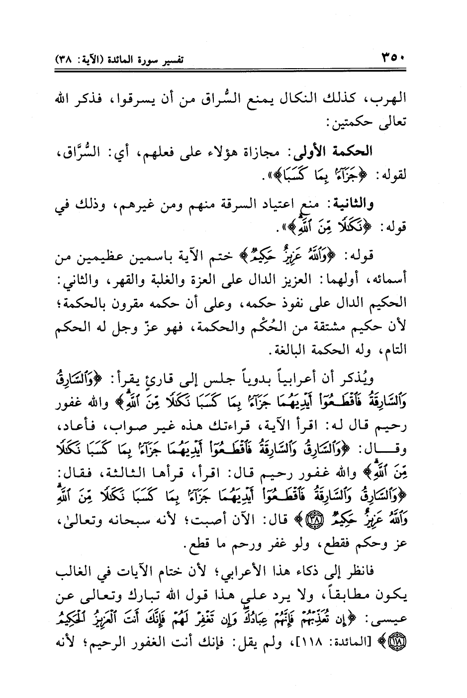 قوله: {وَاللَّهُ عَزِيزٌ حَكِيمٌ} ختم الآية باسمين عظيمين من أسمائه، أولهما: العزيز الدال على العزة والغلبة والقهر، والثاني: الحكيم الدال على نفوذ حكمه، وعلى أن حكمه مقرون بالحكمة؛ لأن حكيم مشتقة من الحُكْم والحكمة، فهو عزّ وجل له الحكم التام، وله الحكمة البالغة. ويُذكر أن أعرابيًا بدويًا جلس إلى قارئٍ يقرأ: {وَالسَّارِقُ وَالسَّارِقَةُ فَاقْطَعُوا أَيْدِيَهُمَا جَزَاءً بِمَا كَسَبَا نَكَالًا مِنَ اللَّهِ} والله غفور رحيم قال له: اقرأ الآية، قراءتك هذه غير صواب، فأعاد، وقال: {وَالسَّارِقُ وَالسَّارِقَةُ فَاقْطَعُوا أَيْدِيَهُمَا جَزَاءً بِمَا كَسَبَا نَكَالًا مِنَ اللَّهِ} والله غفور رحيم قال: اقرأ، قرأها الثالثة، فقال {وَالسَّارِقُ وَالسَّارِقَةُ فَاقْطَعُوا أَيْدِيَهُمَا جَزَاءً بِمَا كَسَبَا نَكَالًا مِنَ اللَّهِ وَاللَّهُ عَزِيزٌ حَكِيمٌ} قال: الآن أصبت؛ لأنه سبحانه وتعالى، عز وحكم فقطع، ولو غفر ورحم ما قطع.