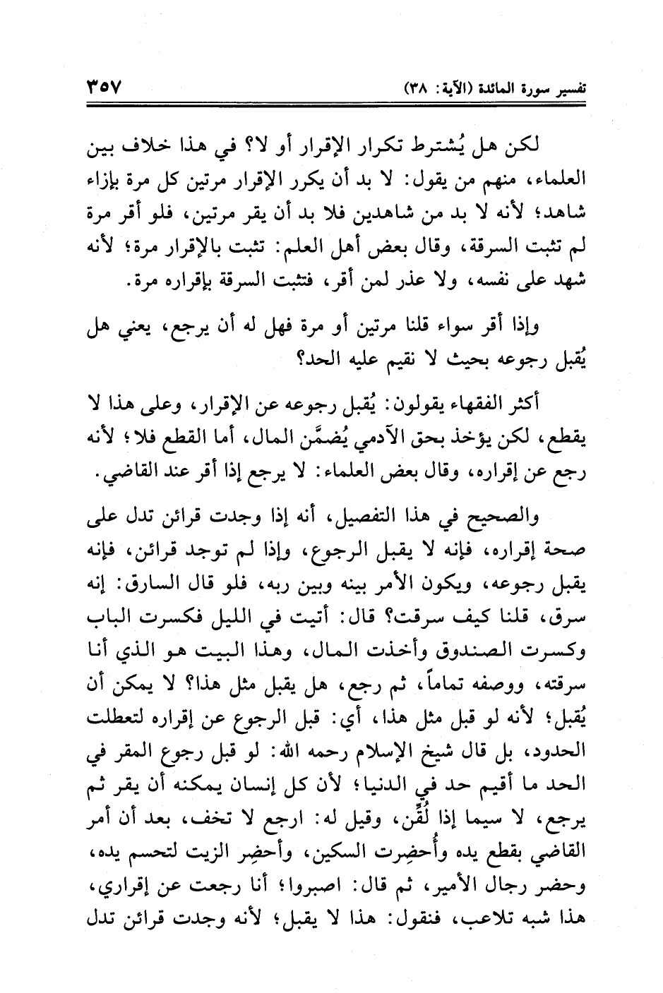 والصحيح في هذا التفصيل، أنه إذا وجدت قرائن تدل على صحة إقراره، فإنه لا يقبل الرجوع، وإذا لم توجد قرائن، فإنه يقبل رجوعه، ويكون الأمر بينه وبين ربه، فلو قال السارق: إنه سرق، قلنا كيف سرقت؟ قال: أتيت في الليل فكسرت الباب وكسرت الصندوق وأخذت المال. وهذا البيت هو الذي أنا سرقته، ووصفه تمامًا، ثم رجع، هل يقبل مثل هذا؟ لا يمكن أن يُقبل؛ لأنه لو قبل مثل هذا، أي: قبل الرجوع عن إقراره لتعطلت الحدود، بل قال شيخ الإسلام رحمه الله: لو قبل رجوع المقر في الحد ما أقيم حد في الدنيا؛ لأن كل إنسان يمكنه أن يقر ثم يرجع، لا سيما إذا لُقِّن، وقيل له: ارجع لا تخف، بعد أن أمر القاضي بقطع يده وأُحضِرت السكين، وأحضِر الزيت لتحسم يده، وحضر رجال الأمير، ثم قال: اصبروا؛ أنا رجعت عن إقراري، هذا شبه تلاعب، فنقول: هذا لا يقبل؛ لأنه وجدت قرائن تدل