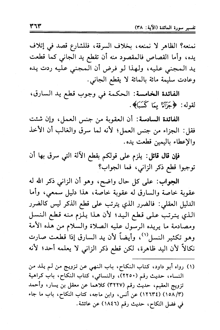الجواب: على كل حال واضح، وهو أن الزاني ذكر الله له عقوبة خاصة والسارق له عقوبة خاصة، هذا دليل سمعي، وأما الدليل العقلي: فالضرر الذي يترتب على قطع الذكر ليس كالضرر الذي يترتب على قطع اليد؛ لأن هذا يلزم منه قطع النسل ومصادمة ما يريده الرسول عليه الصلاة والسلام من هذه الأمة وهو تكثير النسل (¬١)، وأيضأ لأن يد السارق إذًا قطعت صارت نكالًا لأن اليد ظاهرة، لكن قطع ذكر الزاني لا يعلمه أحد؛ لأنه