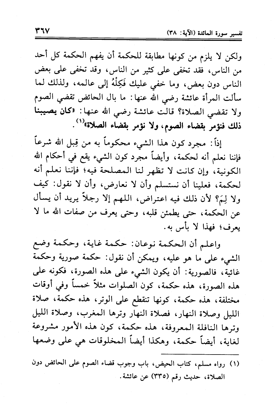 واعلم أن الحكمة نوعان: حكمة غاية، وحكمة وضع الشيء على ما هو عليه، ويمكن أن نقول: حكمة صورية وحكمة غائية، فالصورية: أن يكون الشيء على هذه الصورة، فكونه على هذه الصورة، هذه حكمة، كون الصلوات مثلًا خمسًا وفي أوقات مختلفة، هذه حكمة، كونها تنقطع على الوتر، هذه حكمة، صلاة الليل وصلاة النهار، فصلاة النهار وترها المغرب، وصلاة الليل وترها النافلة المعروفة، هذه حكمة، كون هذه الأمور مشروعة لغاية، أيضًا حكمة، وهكذا أيضًا المخلوقات هي على وضعها