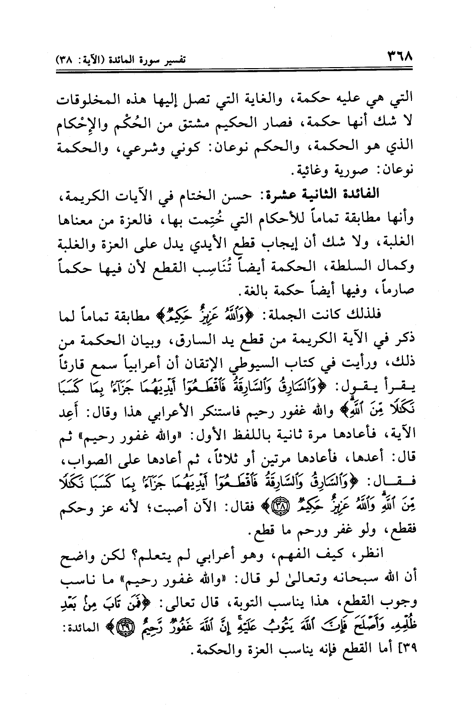 فلذلك كانت الجملة: {وَاللَّهُ عَزِيزٌ حَكِيمٌ} مطابقة تمامًا لما ذكر في الآية الكريمة من قطع يد السارق، وبيان الحكمة من ذلك، ورأيت في كتاب السيوطي الإتقان أن أعرابيًا سمع قارئًا يقرأ يقول: {وَالسَّارِقُ وَالسَّارِقَةُ فَاقْطَعُوا أَيْدِيَهُمَا جَزَاءً بِمَا كَسَبَا نَكَالًا مِنَ اللَّهِ وَاللَّهُ عَزِيزٌ حَكِيمٌ} والله غفور رحيم فاستنكر الأعرابي هذا وقال: أَعِد الآية، فأعادها مرة ثانية باللفظ الأول: "والله غفور رحيم" ثم قال: أعدها، فأعادها مرتين أو ثلاثًا، ثم أعادها على الصواب، فقال: {وَالسَّارِقُ وَالسَّارِقَةُ فَاقْطَعُوا أَيْدِيَهُمَا جَزَاءً بِمَا كَسَبَا نَكَالًا مِنَ اللَّهِ وَاللَّهُ عَزِيزٌ حَكِيمٌ} فقال: الآن أصبت؛ لأنه عز وحكم فقطع، ولو غفر ورحم ما قطع.