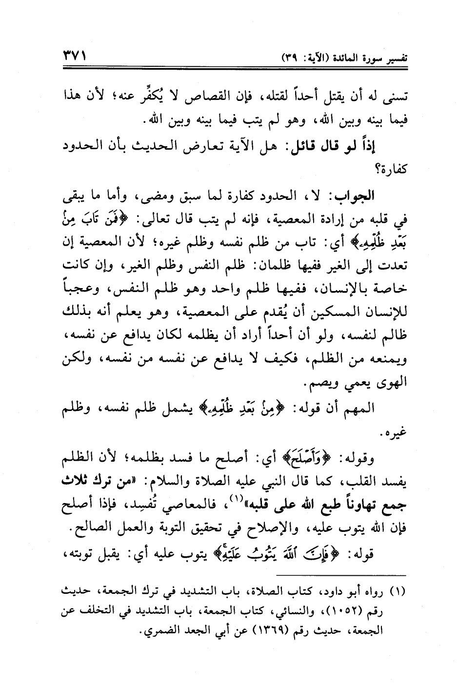 الجواب: لا، الحدود كفارة لما سبق ومضى، وأما ما يبقى في قلبه من إرادة المعصية، فإنه لم يتب قال تعالى: {فَمَنْ تَابَ مِنْ بَعْدِ ظُلْمِهِ} أي: تاب من ظلم نفسه وظلم غيره؛ لأن المعصية إن تعدت إلى الغير فقيها ظلمان: ظلم النفس وظلم الغير، وإن كانت خاصة بالإنسان، ففيها ظلم واحد وهو ظلم النفس، وعجبًا للإنسان المسكين أن يُقدم على المعصية، وهو يعلم أنه بذلك ظالم لنفسه، ولو أن أحدًا أراد أن يظلمه لكان يدافع عن نفسه، ويمنعه من الظلم، فكيف لا يدافع عن نفسه من نفسه، ولكن الهوى يعصي ويصم.