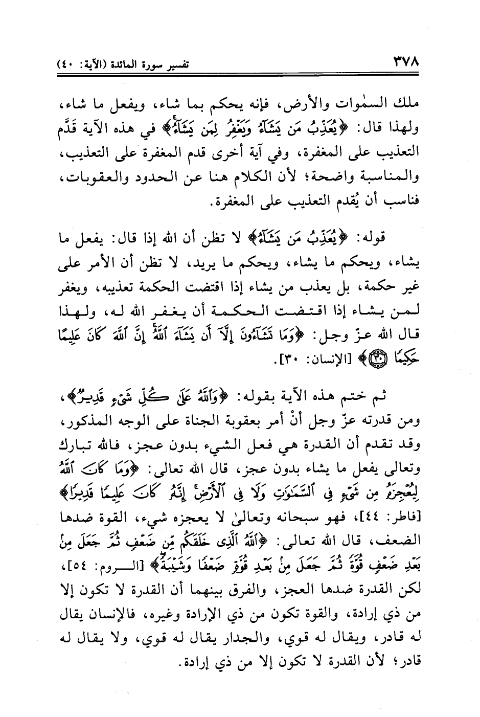 ثم ختم هذه الآية بقوله: {وَاللَّهُ عَلَى كُلِّ شَيْءٍ قَدِيرٌ}، ومن قدرته عزّ وجل أنْ أمر بعقوبة الجناة على الوجه المذكور، وقد تقدم أن القدرة هي فعل الشيء بدون عجز، فالله تبارك وتعالى يفعل ما يشاء بدون عجز، قال الله تعالى: {وَمَا كَانَ اللَّهُ لِيُعْجِزَهُ مِنْ شَيْءٍ فِي السَّمَاوَاتِ وَلَا فِي الْأَرْضِ إِنَّهُ كَانَ عَلِيمًا قَدِيرًا} [فاطر: ٤٤]، فهو سبحانه وتعالى لا يعجزه شيء، القوة ضدها الضعف، قال الله تعالى: {اللَّهُ الَّذِي خَلَقَكُمْ مِنْ ضَعْفٍ ثُمَّ جَعَلَ مِنْ بَعْدِ ضَعْفٍ قُوَّةً ثُمَّ جَعَلَ مِنْ بَعْدِ قُوَّةٍ ضَعْفًا وَشَيْبَةً} [الروم: ٥٤]، لكن القدرة ضدها العجز، والفرق بينهما أن القدرة لا تكون إلا من ذي إرادة، والقوة تكون من ذي الإرادة وغيره، فالإنسان يقال له قادر، ويقال له قوي، والجدار يقال له قوي، ولا يقال له قادر، لأن القدرة لا تكون إلا من ذي إرادة.