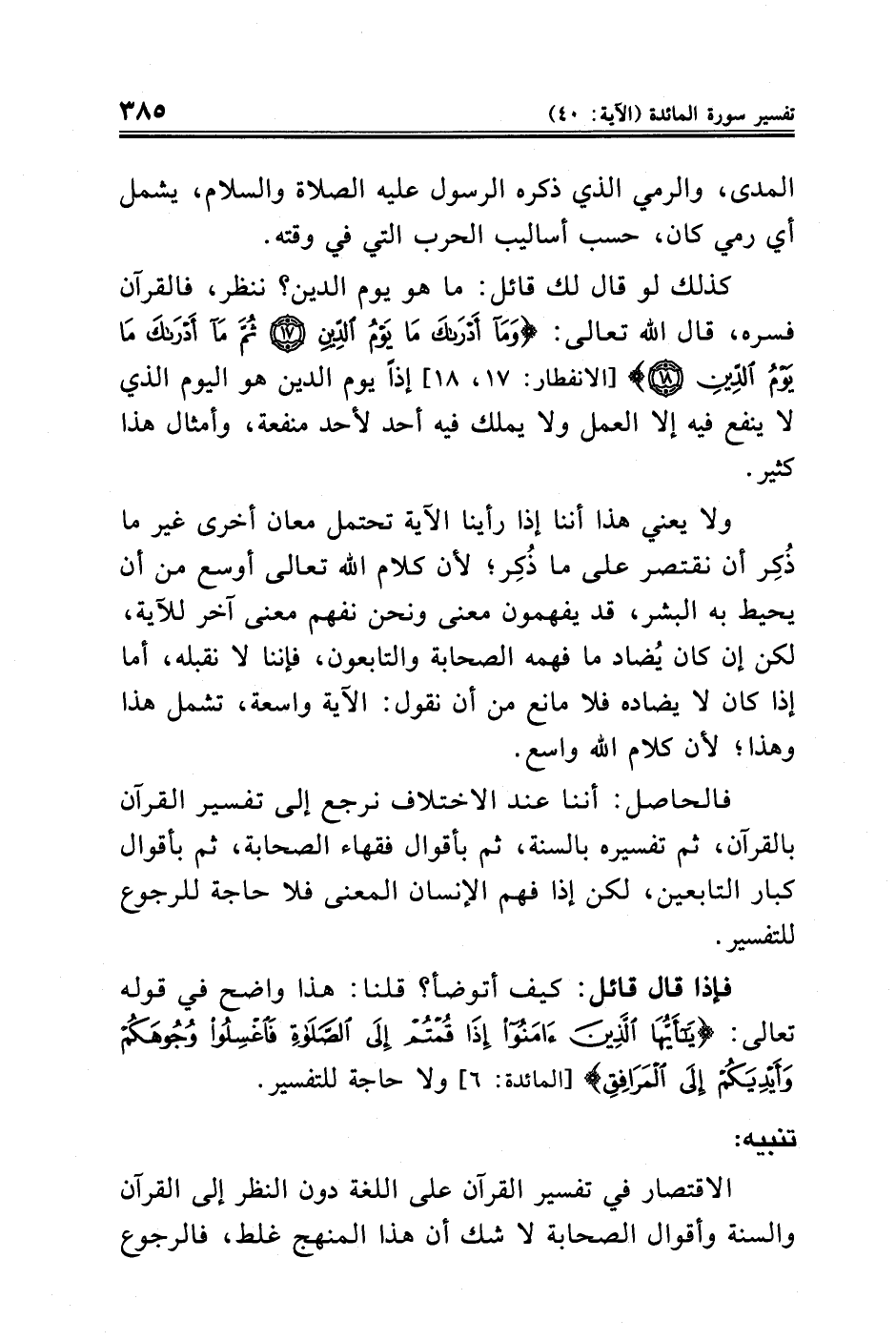 ولا يعني هذا أننا إذا رأينا الآية تحتمل معان أخرى غير ما ذُكِر أن نقتصر على ما ذُكِر؛ لأن كلام الله تعالى أوسع من أن يحيط به البشر، قد يفهمون معنى ونحن نفهم معنى آخر للآية، لكن إن كان يُضاد ما فهمه الصحابة والتابعون، فإننا لا نقبله، أما إذا كان لا يضاده فلا مانع من أن نقول: الآية واسعة، تشمل هذا وهذا؛ لأن كلام الله واسع.