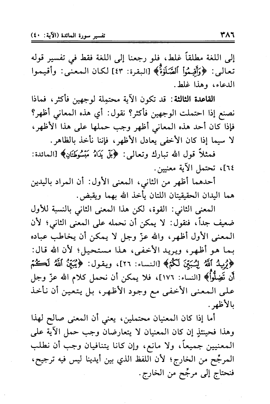 القاعدة الثالثة: قد تكون الآية محتمِلة لوجهين فأكثر، فماذا نصنع إذا احتملت الوجهين فأكثر؟ نقول: أي هذه المعاني أظهر؟ فإذا كان أحد هذه المعاني أظهر وجب حملها على هذا الأظهر، لا سيما إذا كان الأخفى يعادل الأظهر، فإننا نأخذ بالظاهر.