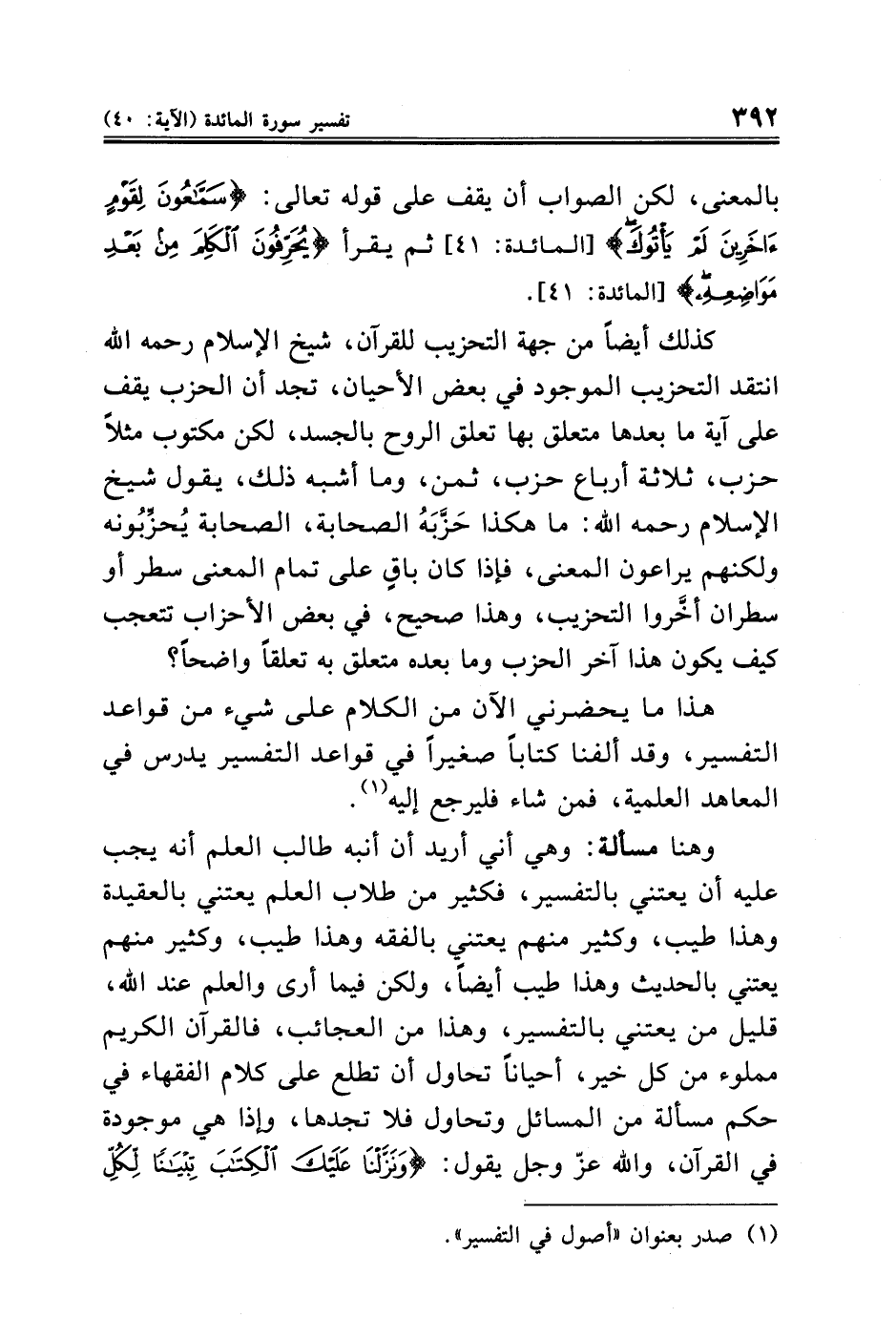 وهنا مسألة: وهي أني أريد أن أنبه طالب العلم أنه يجب عليه أن يعتني بالتفسير، فكثير من طلاب العلم يعتني بالعقيدة وهذا طيب، وكثير منهم يعتني بالفقه وهذا طيب، وكثير منهم يعتني بالحديث وهذا طيب أيضًا، ولكن فيما أرى والعلم عند الله، قليل من يعتني بالتفسير، وهذا من العجائب، فالقرآن الكريم مملوء من كل خير، أحيانًا تحاول أن تطلع على كلام الفقهاء في حكم مسألة من المسائل وتحاول فلا تجدها، وإذا هي موجودة في القرآن، والله عزّ وجل يقول: {وَنَزَّلْنَا عَلَيْكَ الْكِتَابَ تِبْيَانًا لِكُلِّ