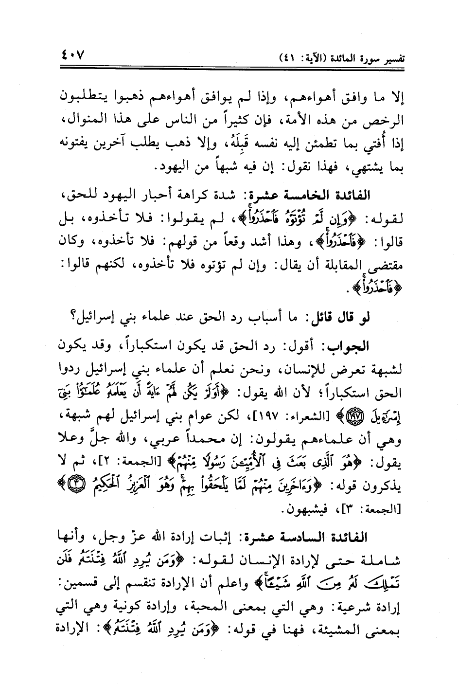 الفائدة السادسة عشرة: إثبات إرادة الله عزّ وجل، وأنها شاملة حتى لإرادة الإنسان لقوله: {وَمَنْ يُرِدِ اللَّهُ فِتْنَتَهُ فَلَنْ تَمْلِكَ لَهُ مِنَ اللَّهِ شَيْئًا} واعلم أن الإرادة تنقسم إلى قسمين: إرادة شرعية: وهي التي بمعنى المحبة، وإرادة كونية وهي التي بمعنى المشيئة، فهنا في قوله: {وَمَنْ يُرِدِ اللَّهُ فِتْنَتَهُ}: الإرادة