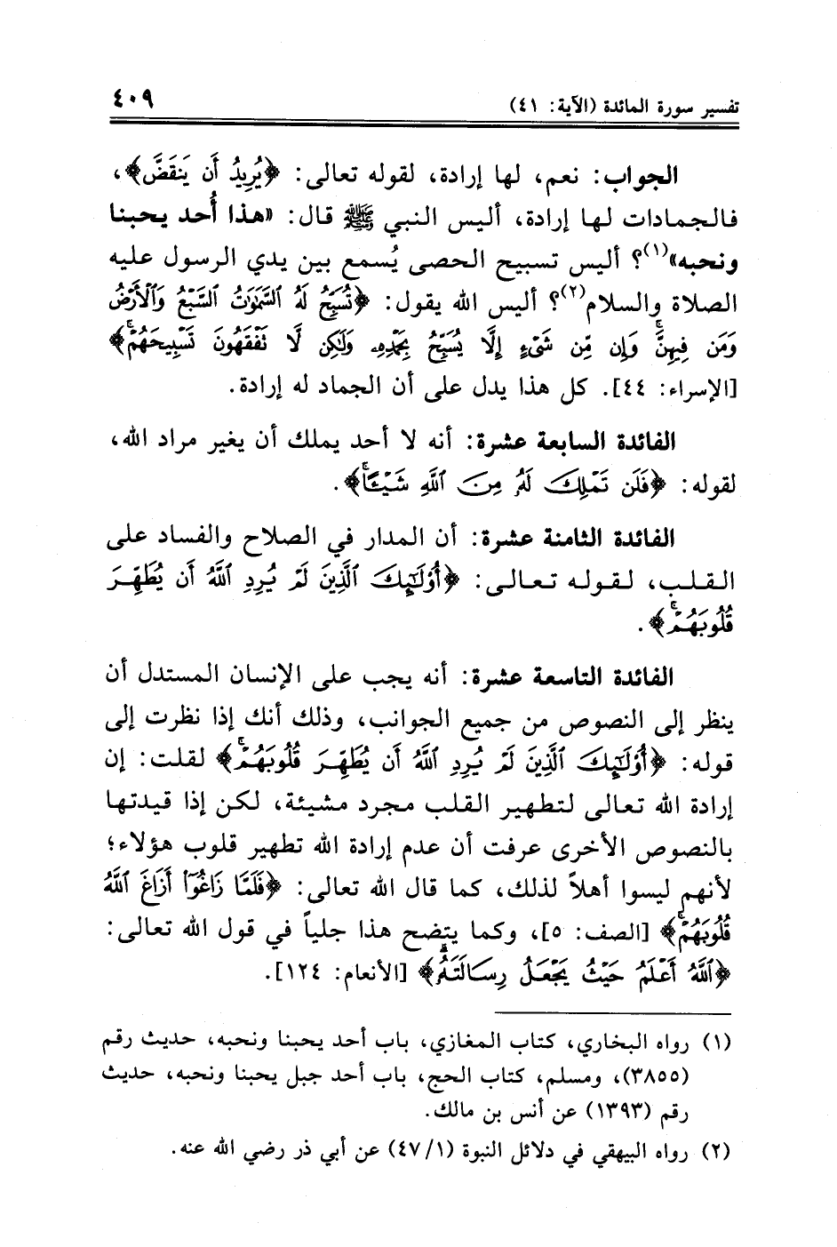 الفائدة التاسعة عشرة: أنه يجب على الإنسان المستدل أن ينظر إلى النصوص من جميع الجوانب، وذلك أنك إذا نظرت إلى قوله: {أُولَئِكَ الَّذِينَ لَمْ يُرِدِ اللَّهُ أَنْ يُطَهِّرَ قُلُوبَهُمْ} لقلت: إن إرادة الله تعالى لتطهير القلب مجرد مشيئة، لكن إذا قيدتها بالنصوص الأخرى عرفت أن عدم إرادة الله تطهير قلوب هؤلاء؛ لأنهم ليسوا أهلًا لذلك، كما قال الله تعالى: {فَلَمَّا زَاغُوا أَزَاغَ اللَّهُ قُلُوبَهُمْ} [الصف: ٥]، وكما يبضح هذا جليًّا في قول الله تعالى: {اللَّهُ أَعْلَمُ حَيْثُ يَجْعَلُ رِسَالَتَهُ} [الأنعام: ١٢٤].