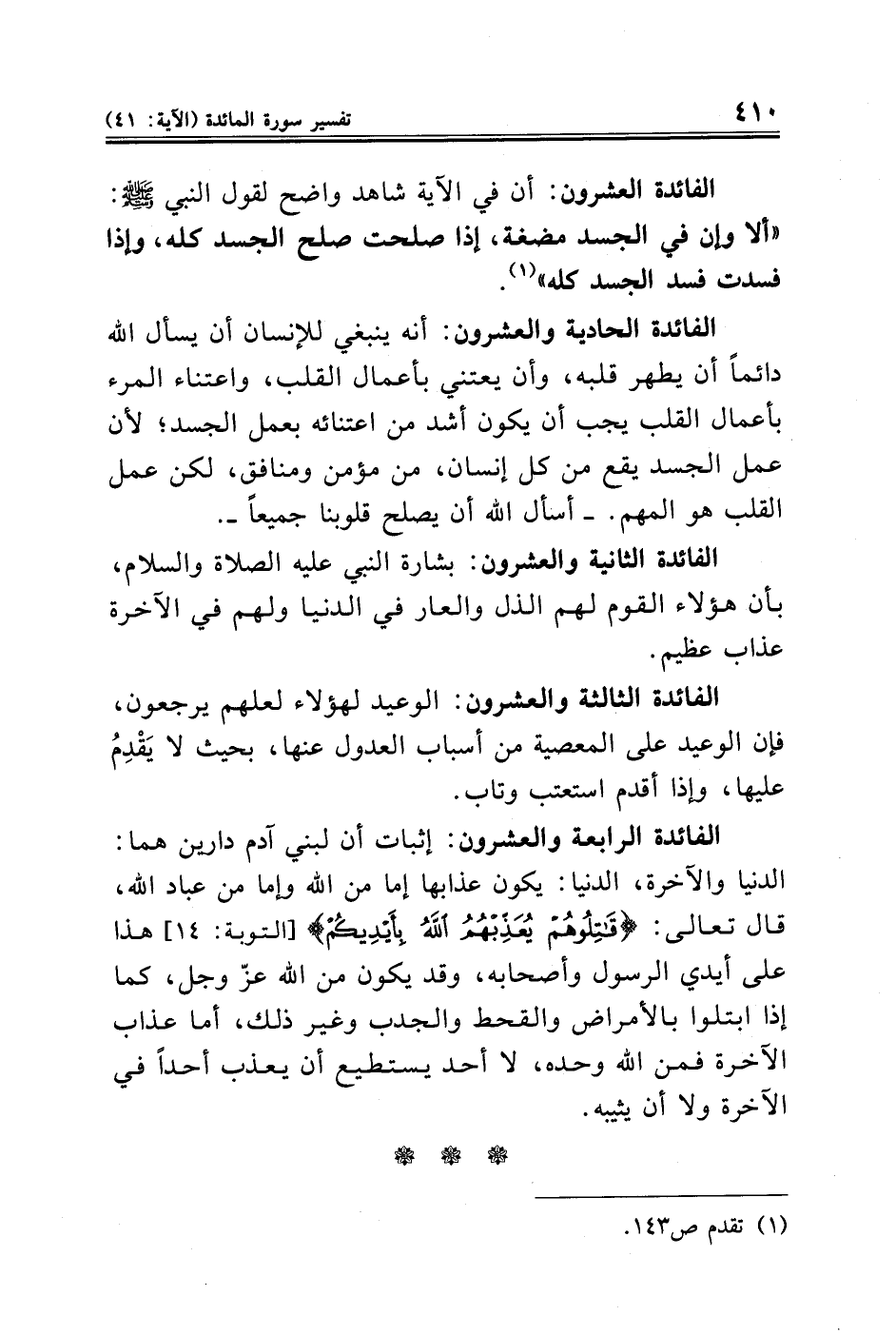الفائدة العشرون: أن في الآية شاهد واضح لقول النبي - صلى الله عليه وسلم -: "ألا وإن في الجسد مضغة، إذا صلحت صلح الجسد كله، وإذا فسدت فسد الجسد كله" (¬١).