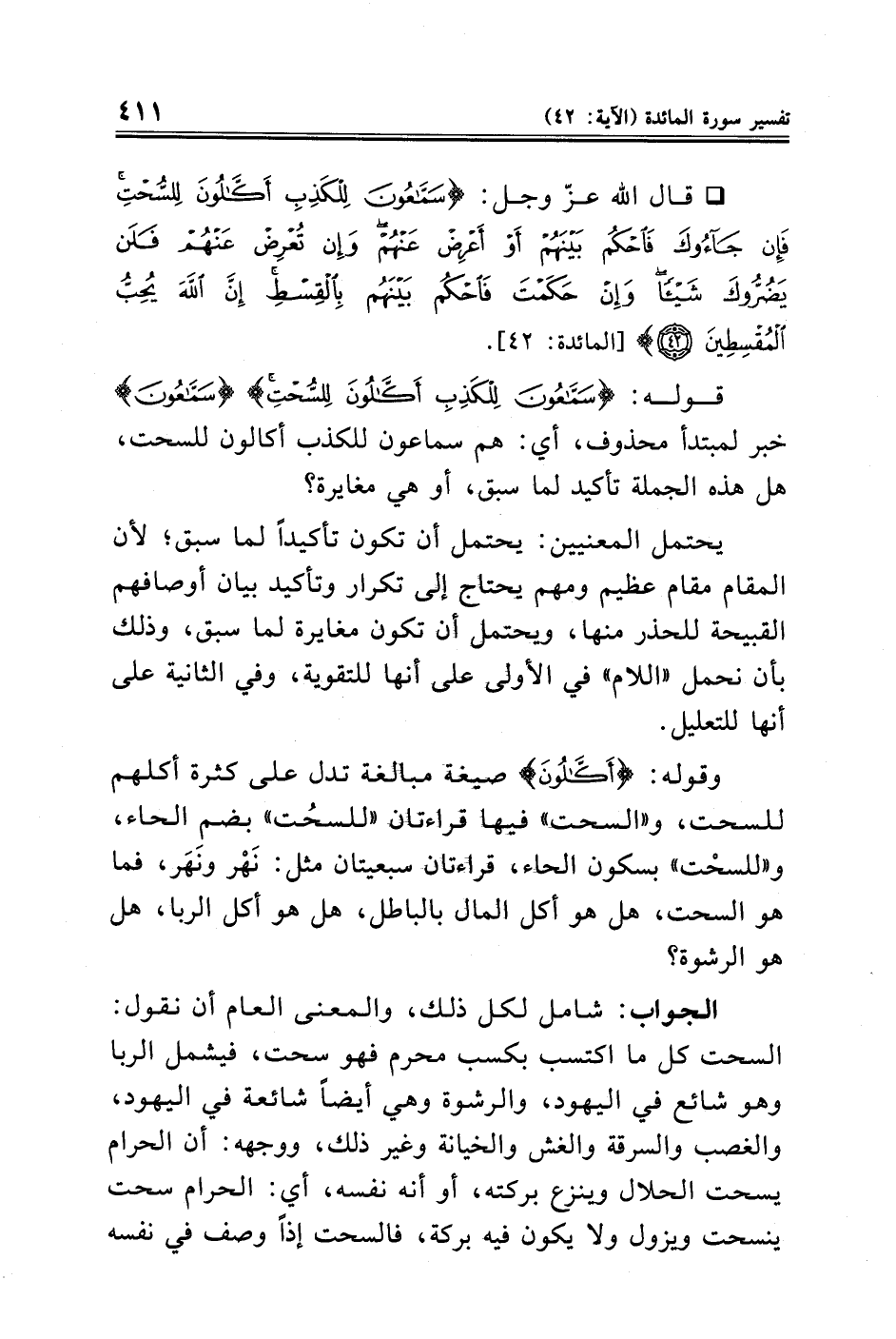 وقوله: {أَكَّالُونَ} صيغة مبالغة تدل على كثرة أكلهم للسحت، و"السحت" فيها قراءتان "للسحُت" بضم الحاء، و"للسحْت" بسكون الحاء، قراءتان سبعيتان مثل: نَهْر ونَهَر، فما هو السحت، هل هو أكل المال بالباطل، هل هو أكل الربا، هل هو الرشوة؟