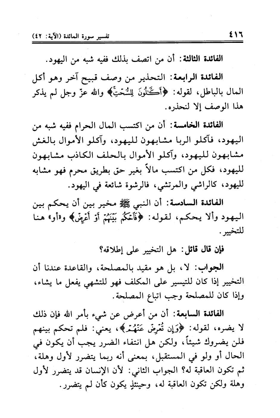 الفائدة السادسة: أن النبي - صلى الله عليه وسلم - مخير بين أن يحكم بين اليهود وألا يحكم، لقوله: {فَاحْكُمْ بَيْنَهُمْ أَوْ أَعْرِضْ عَنْهُمْ} و"أو" هنا للتخيير.