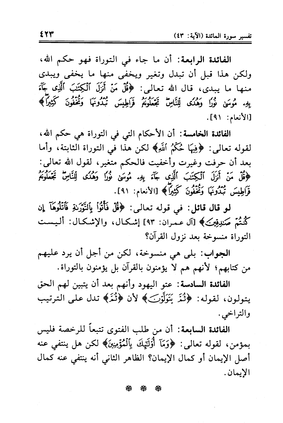 الفائدة الخامسة: أن الأحكام التي في التوراة هي حكم الله، لقوله تعالى: {فِيهَا حُكْمُ اللَّهِ} لكن هذا في التوراة الثابتة، وأما بعد أن حرفت وغيرت وأخفيت فالحكم متغير، لقول الله تعالى: {قُلْ مَنْ أَنْزَلَ الْكِتَابَ الَّذِي جَاءَ بِهِ مُوسَى نُورًا وَهُدًى لِلنَّاسِ تَجْعَلُونَهُ قَرَاطِيسَ تُبْدُونَهَا وَتُخْفُونَ كَثِيرًا} [الأنعام: ٩١].
