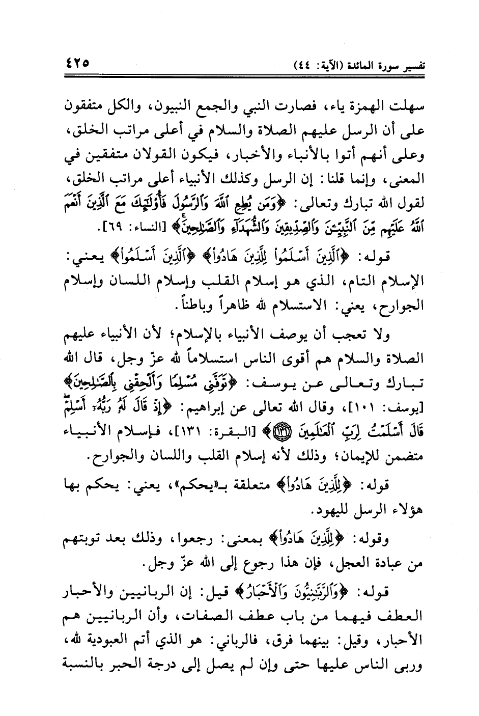 قوله: {الَّذِينَ أَسْلَمُوا لِلَّذِينَ هَادُوا} {الَّذِينَ أَسْلَمُوا} يعني: الإسلام التام، الذي هو إسلام القلب وإسلام اللسان وإسلام الجوارح، يعني: الاستسلام لله ظاهرًا وباطنًا.