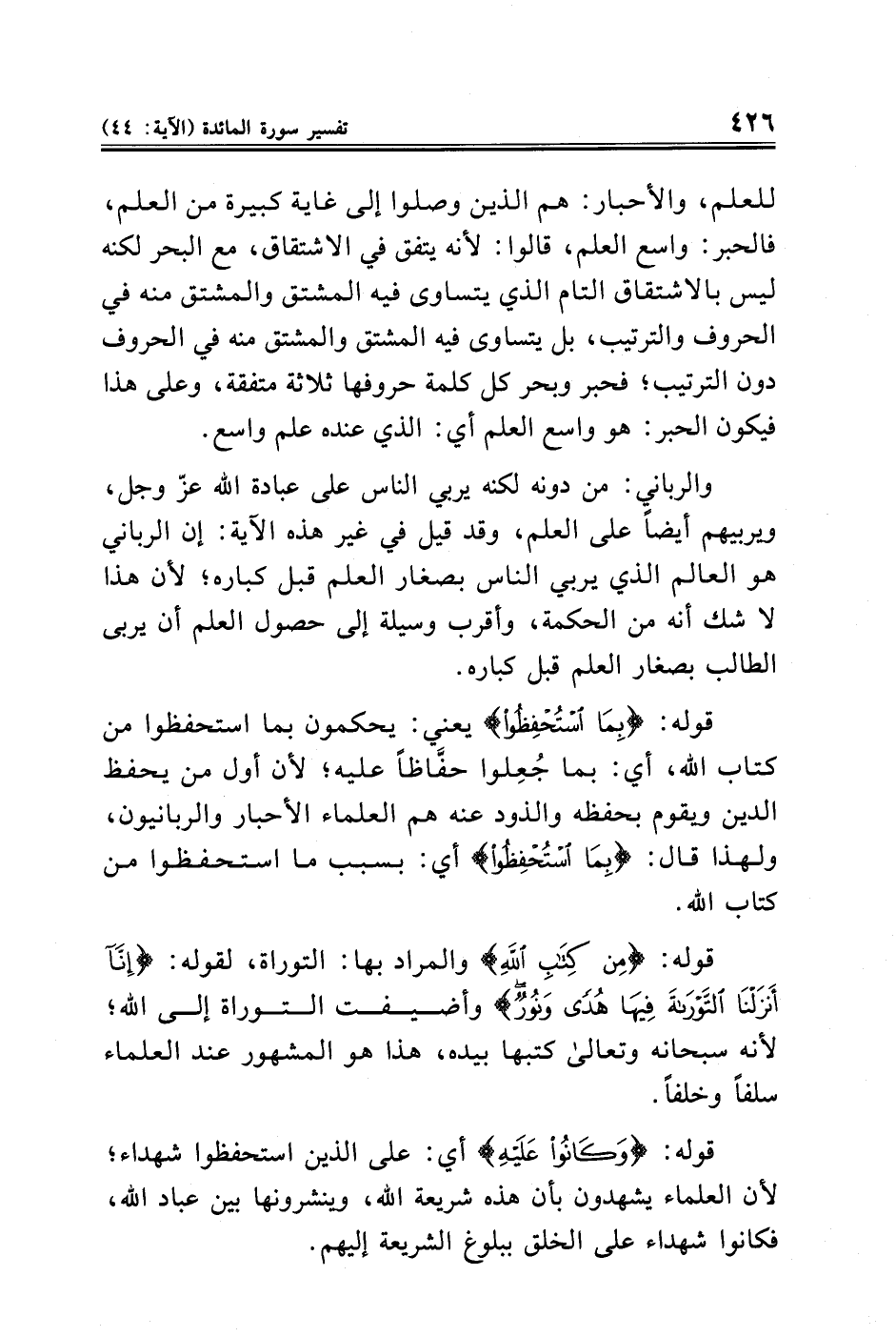 للعلم، والأحبار: هم الذين وصلوا إلى غاية كبيرة من العلم، فالحبر: واسع العلم، قالوا: لأنه يتفق في الاشتقاق، مع البحر لكنه ليس بالاشتقاق التام الذي يتساوى فيه المشتق والمشتق منه في الحروف والترتيب، بل يتساوى فيه المشتق والمشتق منه في الحروف دون الترتيب؛ فحبر وبحر كل كلمة حروفها ثلاثة متفقة، وعلى هذا فيكون الحبر: هو واسع العلم أي: الذي عنده علم واسع.